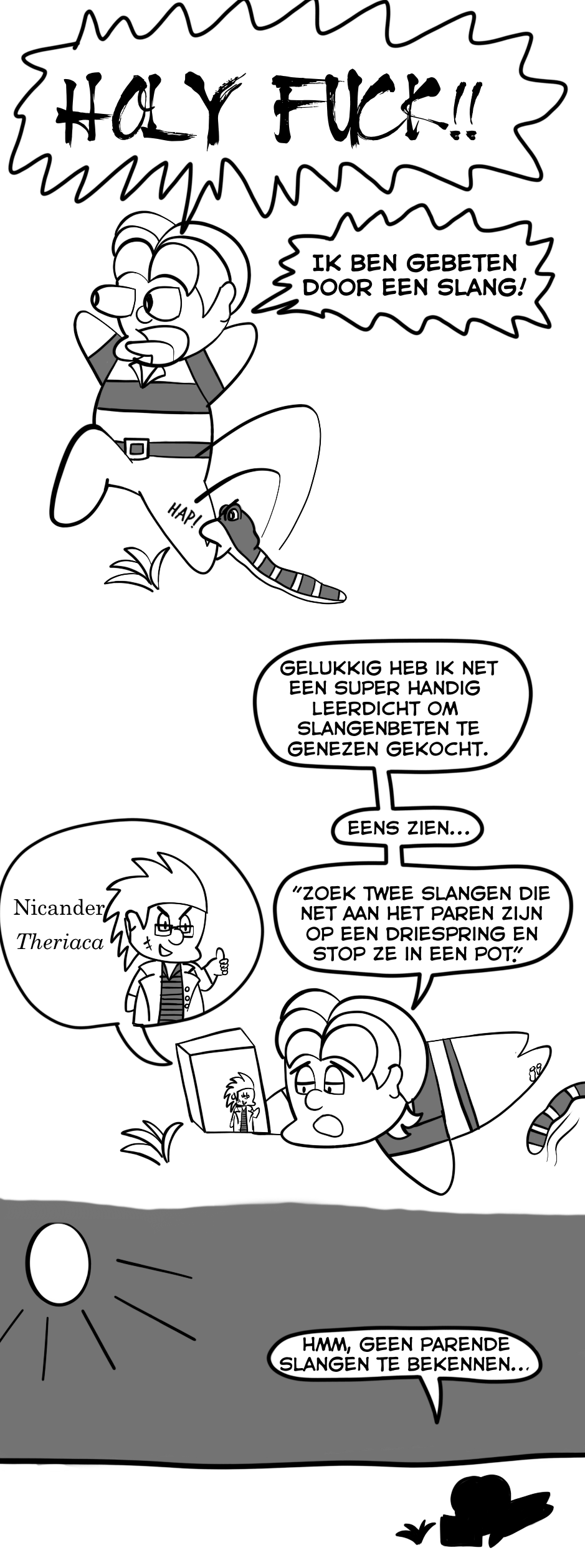 Ik verzin dit niet, dit zijn oprechte citaten uit Nicanders Theriaca, een leerdicht over giftige slangen en medicijnen tegen hun beten (respectievelijk Ther. 98-100, 559-60, 565 en 915-20). Er bestaat discussie over de vraag over de praktische waarde van de Theriaca, maar volgens mij moet je het, gezien de enorme hoeveelheid klinklare onzin, vooral zien als een literair spel en niet als een echte gids tegen slangenbeten.
