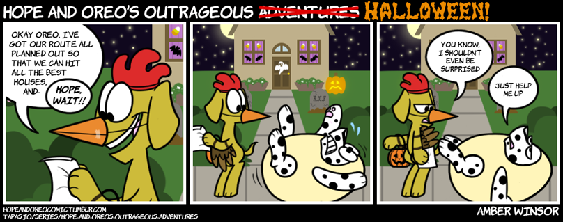Welcome to Hope and Oreo’s Outrageous Halloween 2017! This is the very first H&O Halloween ever published, and I’ll be trying to make it extra special by posting 8 full Halloween-themed comics this month! Make sure to check back every Tuesday and Saturday this month for a brand new spooky Hope and Oreo!