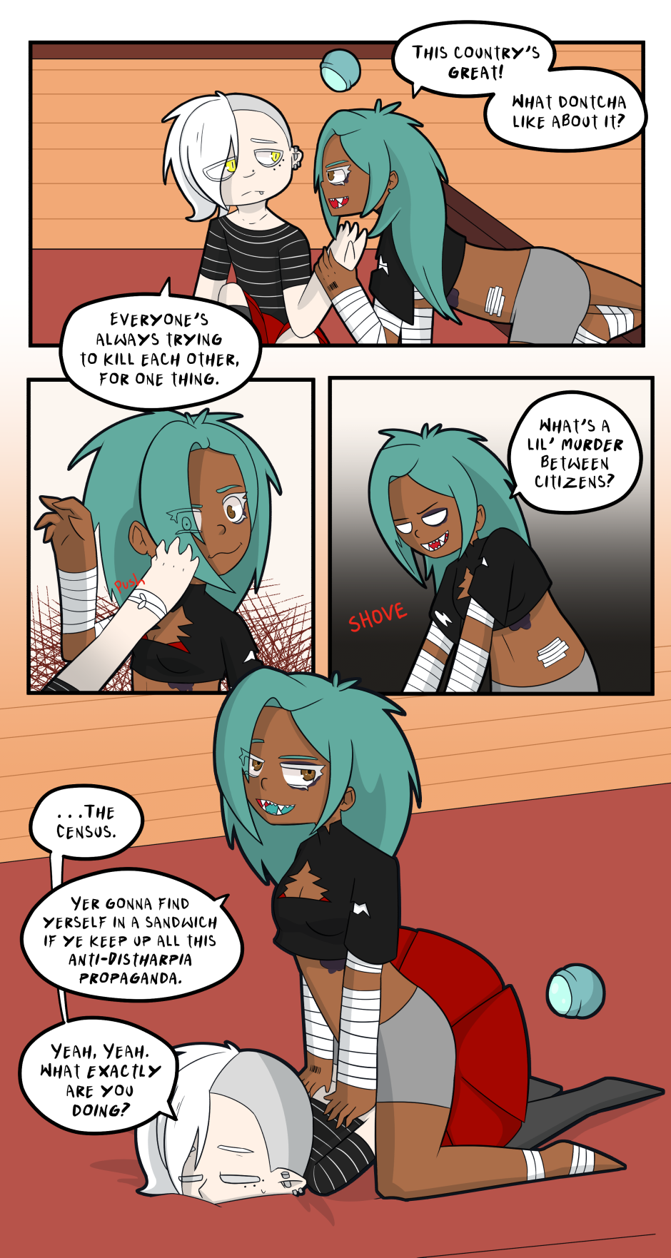 I've decided to draw teeth more consistent. Makes everyone look nicer .3. ---- Alas, Distharpia isn't as nice as it seems. Sure it's got advanced technology and loyal citizens, but... that's about where the good things end.