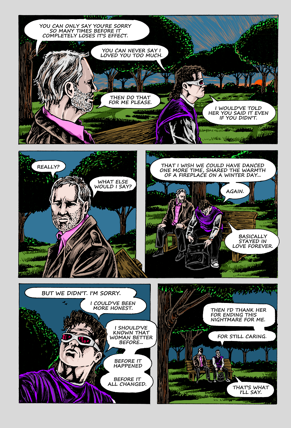 Park Closes at Sunset is a bit of an artistic experiment in using photo references so some of the eagle eyed among you might recognize the man on the bench as Oddly Vanilla's own Edward Bohlman!!