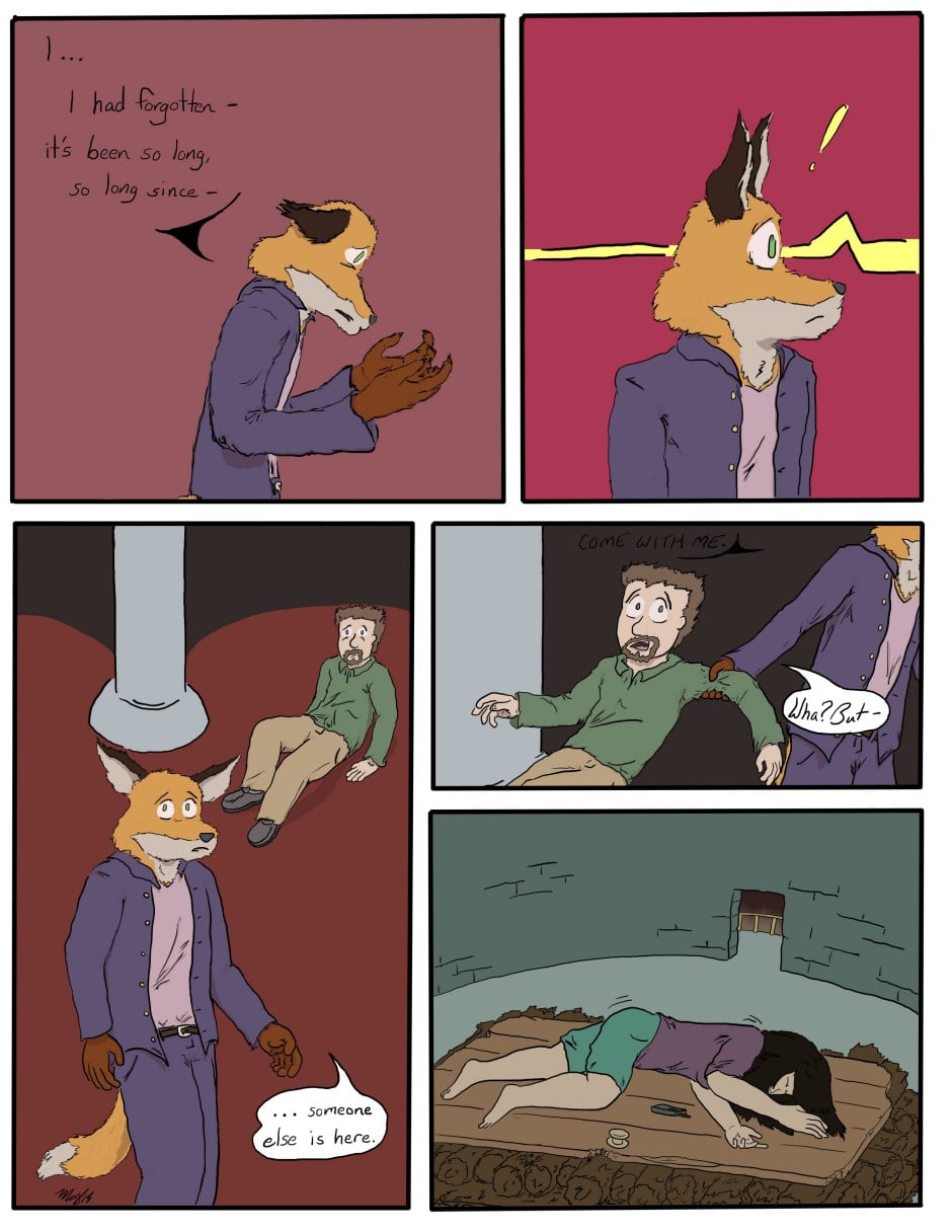 Following my summer hiatus, this page was the first to be drawn digitally and colored (with excrutiatingly bright colors, yuck) - but I still didn’t know what I was doing, and having gone three months with little drawing practice resulted in some of the ugliest linework I have ever done. I also remembered while remastering this that I didn’t know how to adjust the pen settings in my art program (FireAlpaca at the time) and so I had to manually change the size of the pen to get different sized lines. The frustration from my lack of knowledge, lack of story planning, and mounting stress in real life led to the comic ending three updates / two months later.