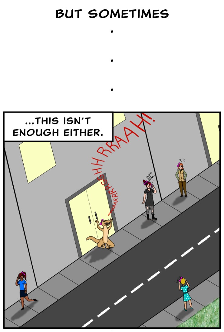 This is the story of a man and medium-sized dinosaur struggling to find her humanity. He thinks she's just perfect when she's not mauling old ladies. She thinks that humans are a great resource and dog parks are the best grocers. Hijinks ensue!