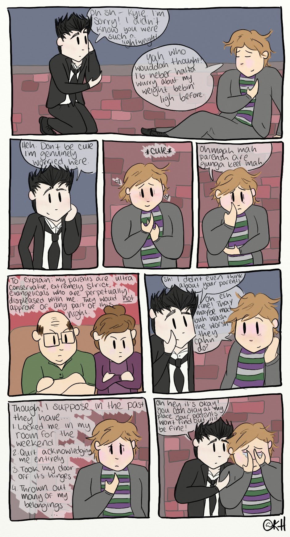 3. There was a text panel that said, "I should explain: my parents are ultra-conservative evangelicals who are impossibly strict and perpetually displeased with me. They would not approve of anything about this evening." This was condensed in the redraw to fit into an illustrated panel.