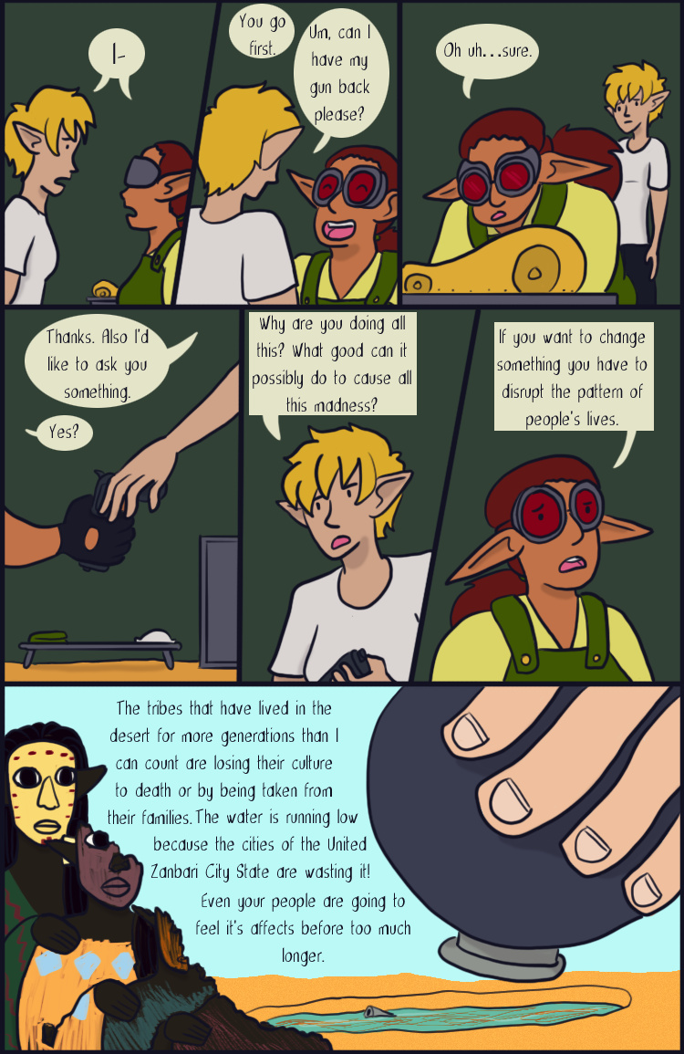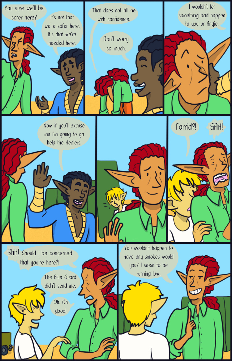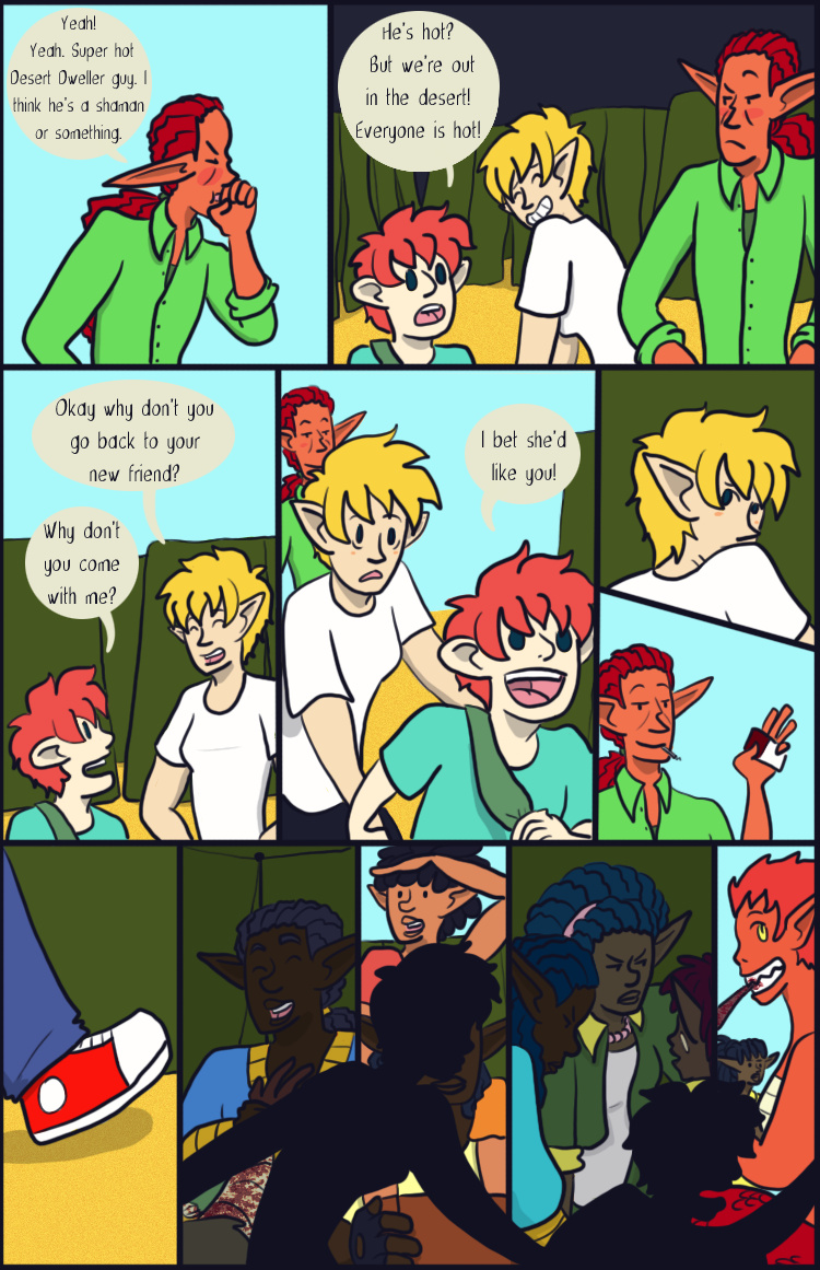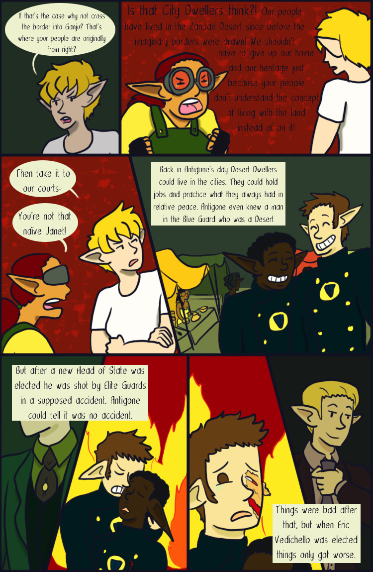 Desert Grey is a tale of gay elves who over come oppression with explosions in a fantasy world during it's equivalent of the 1960s. More specifically it's about two stories happening simultaneously about a lesbian cop who searches for answers after tragedy befalls her and a gay biracial alcoholic who reconnects with his father's people.