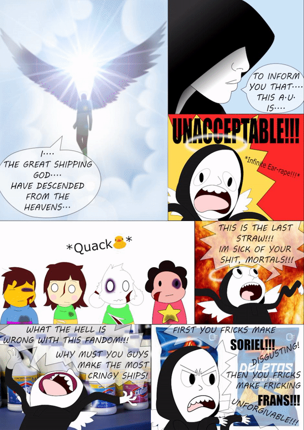 Plot: From a misunderstanding, Chara has accidently shipped her step brother, Asriel, and Steven Universe in a homosexual ship! Which caused everyone in the Undertale and Steven Universe to cringe and summon the mysterious shipping god to destroy this sinful AU!