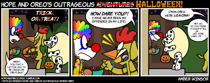 Welcome to Hope and Oreo’s Outrageous Halloween 2017! This is the very first H&O Halloween ever published, and I’ll be trying to make it extra special by posting 8 full Halloween-themed comics this month! Make sure to check back every Tuesday and Saturday this month for a brand new spooky Hope and Oreo!