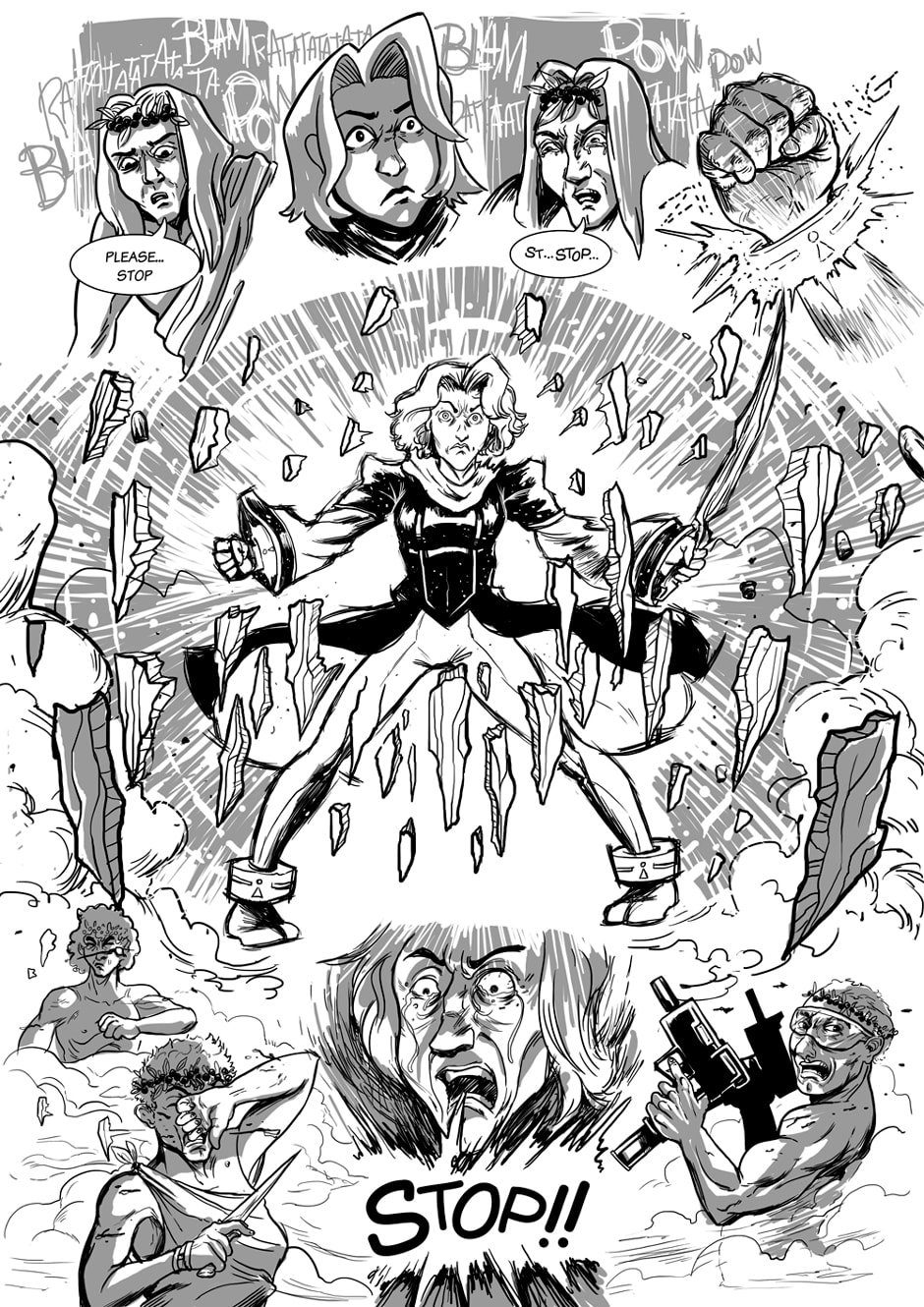 A desperate scream, a superpowered warrior, a furious weaponized crowd.