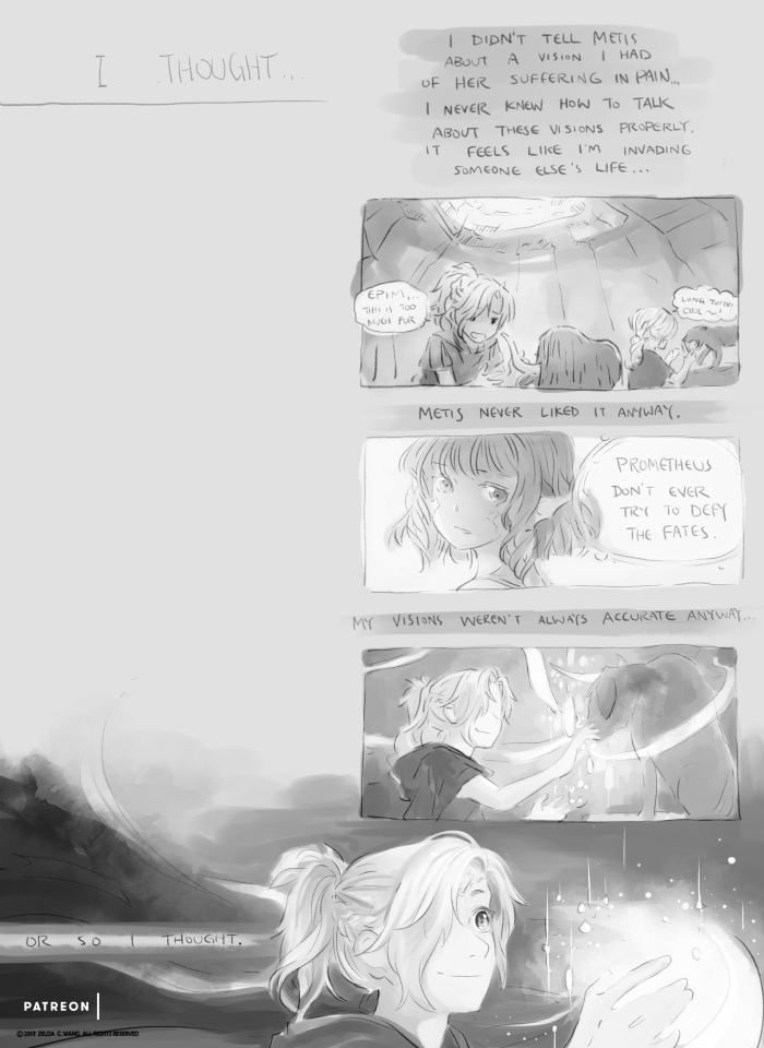 I really like Prometheus! He's like that guy who knows everything (well, maybe not really everything), but he keeps it to himself. Sometimes it feels like he's letting out a wise advice, but another time, he's keeping the sad truth to himself ("thanks" to his visions, I guess). And I like the kinda-mature and mutual relationship of Metis and Prometheus. Now I rather ship them than Zeus x Metis. This is hard haha