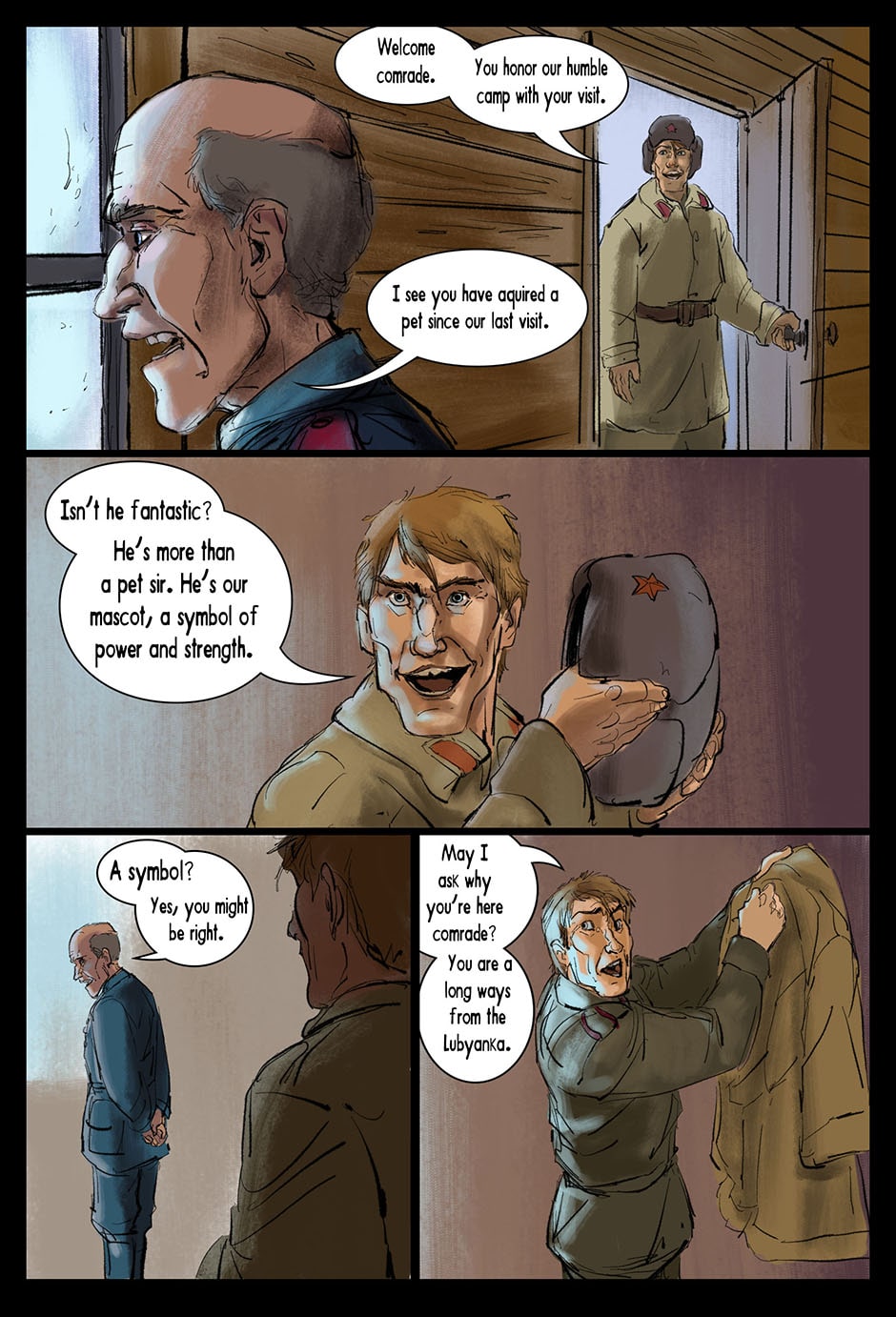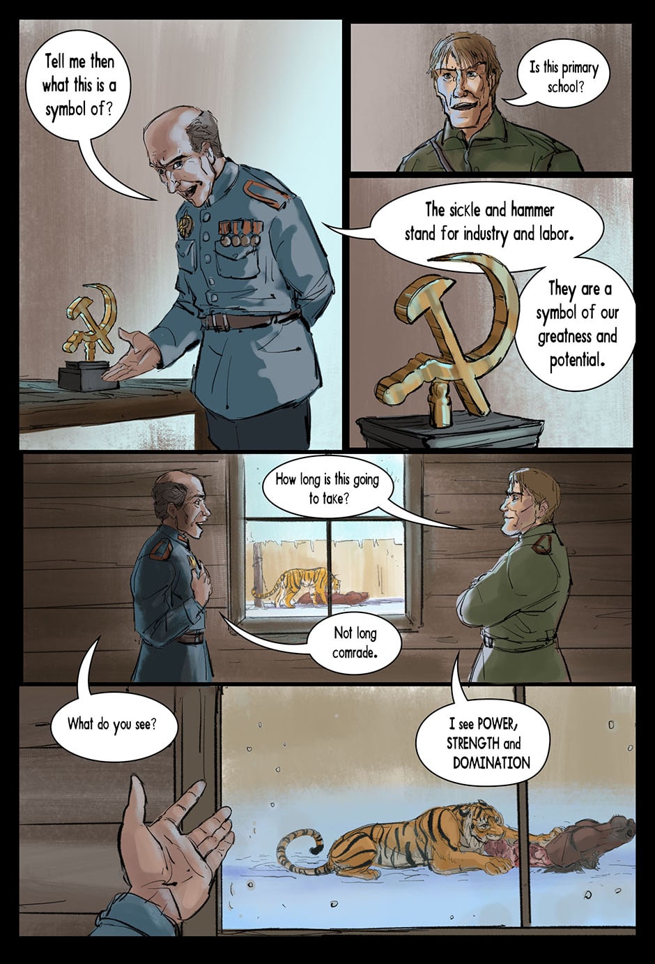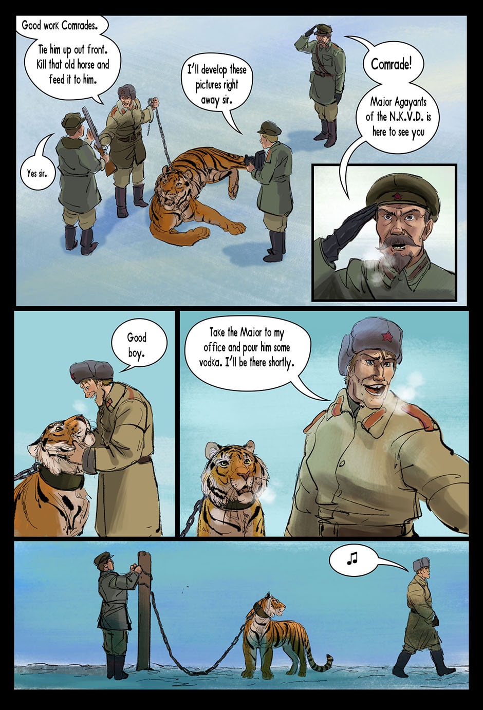 Set in a fictional post WW2 Russia an Amur Tiger lives alone in a forgotten prison camp in the far east. One eye was destroyed by the whip, the other branded and scarred with a sickle and hammer. Though blind, the Tiger learns how to see with the aid of his friend, Muzak the raven. The Tiger is unwittingly drawn into a larger conflict over the control of the Taiga (the great northern forest of Russia). The Tribe of the Wolf and the Clan of the Boar both vie for control and the Tiger becomes the tipping point and must chose the fate of the Taiga. Updates every Friday on Taptastic and ever Monday and Thursday on the direct website.