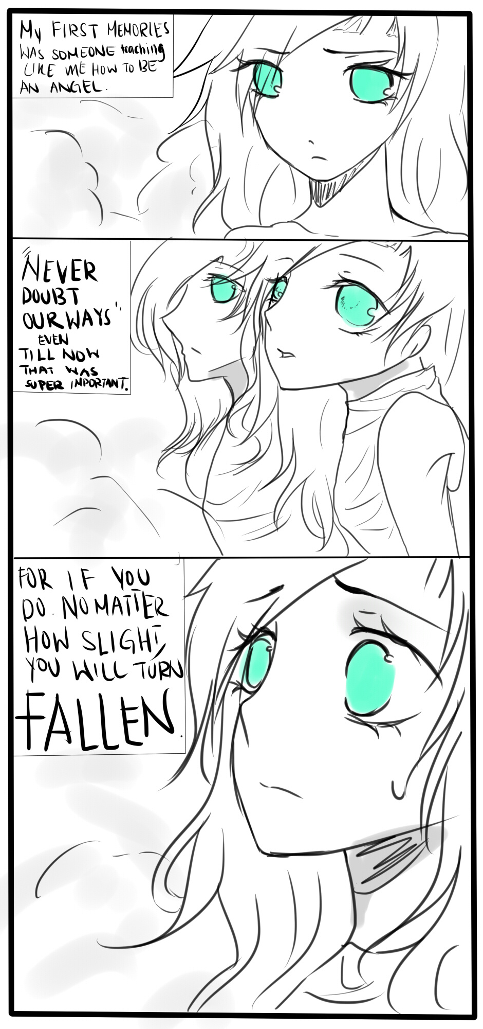 I think that you should make the writing a little bit easier to read. Some of the letters stick together, and I have to really focus to read it. Good story so far though! :3