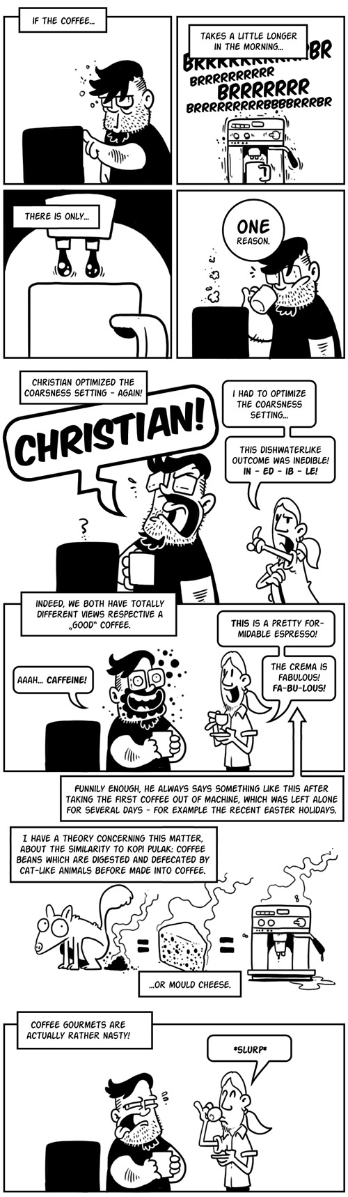 I have to work with coffee gourmets. original: http://blog.beetlebum.de/2013/04/11/kaffee-feinschmecker-geheimnis/
