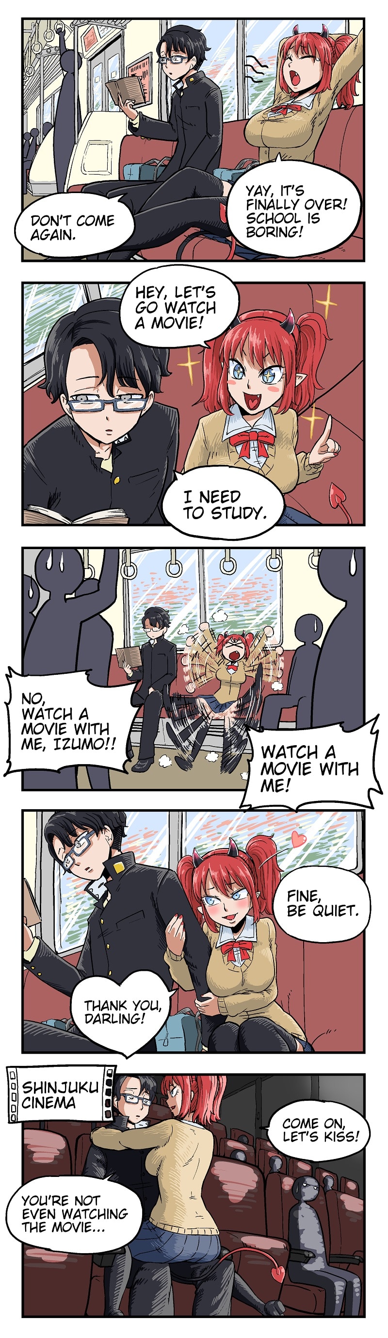 [UPDATES Fridays] Izumo is a scary-looking elite student. Everyone is afraid of him, but in reality, he just wants fun friends and a cute girlfriend. One day a succubus named Anastasia visits him to try and steal his virginity.
