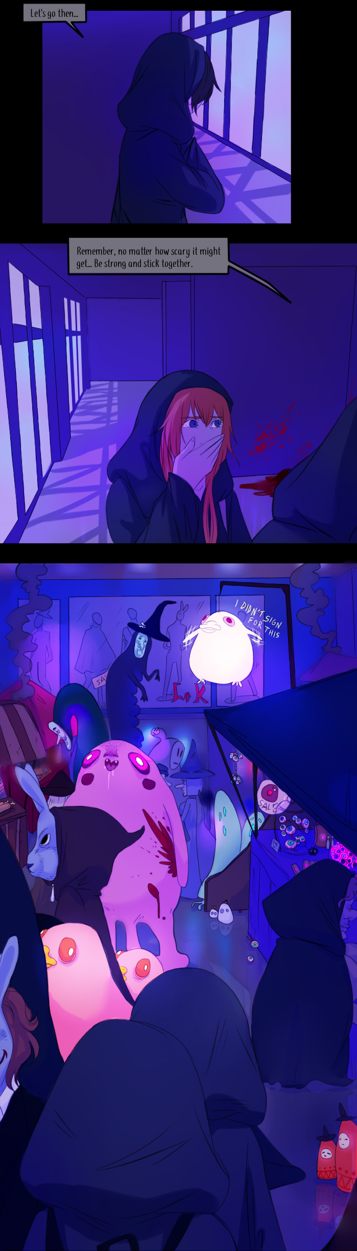 When they can, they should get some Halloween supplies to better disguise themselves. Also I hope she hides her hair in the jacket. It would be interesting to see them wear make-up to hide their humanness. This comic looks great so far and I cannnnot wait for more. ^^