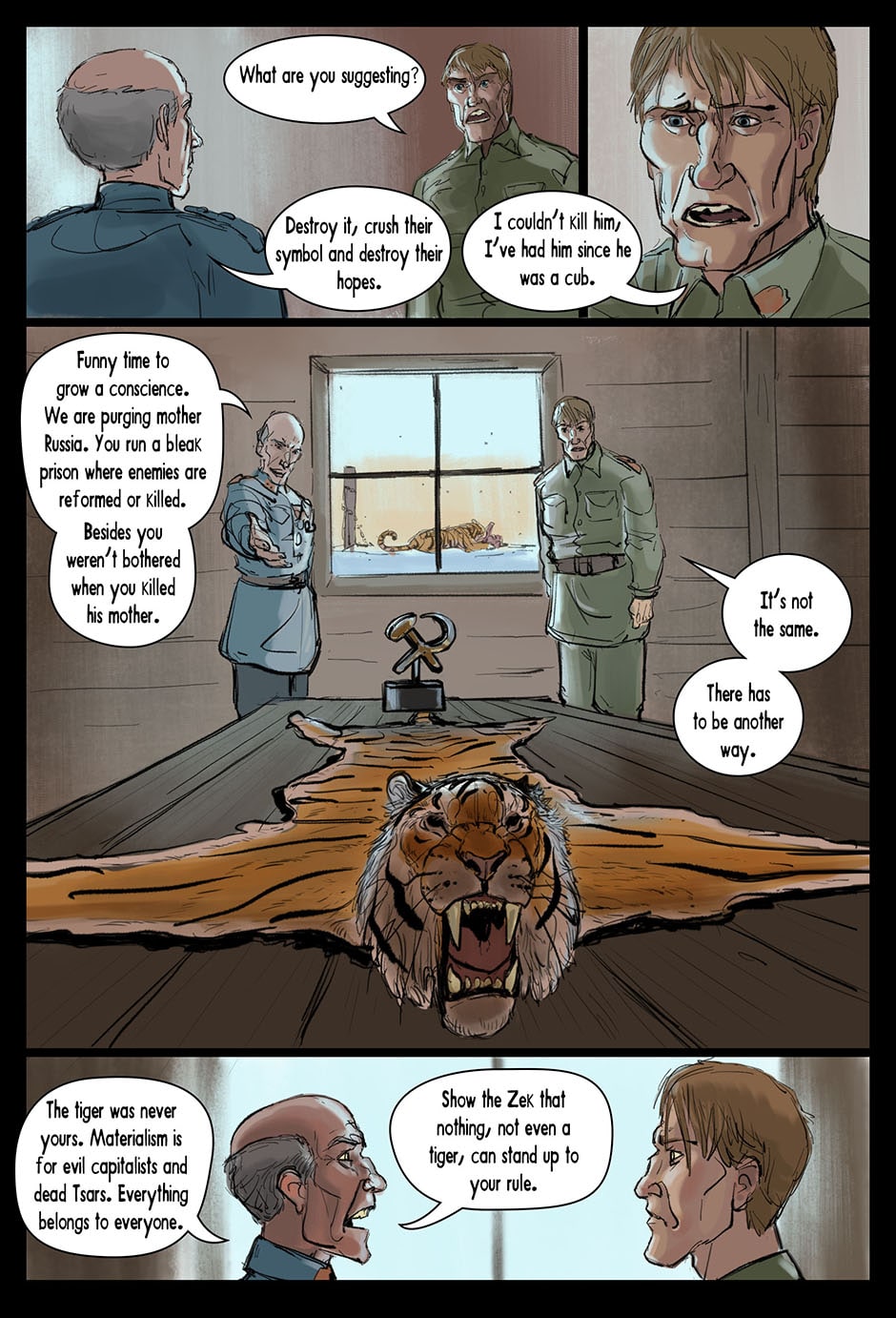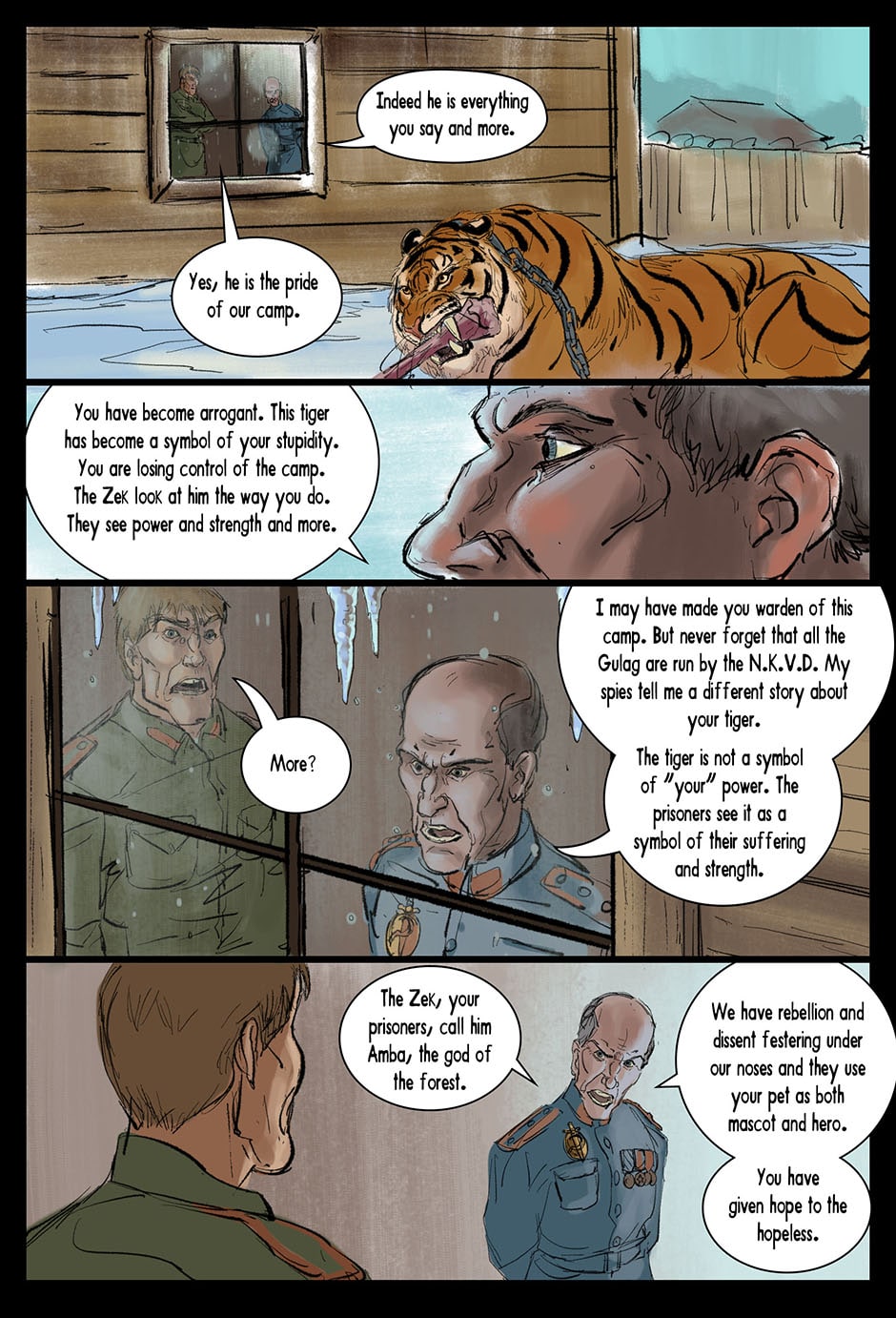 Set in a fictional post WW2 Russia an Amur Tiger lives alone in a forgotten prison camp in the far east. One eye was destroyed by the whip, the other branded and scarred with a sickle and hammer. Though blind, the Tiger learns how to see with the aid of his friend, Muzak the raven. The Tiger is unwittingly drawn into a larger conflict over the control of the Taiga (the great northern forest of Russia). The Tribe of the Wolf and the Clan of the Boar both vie for control and the Tiger becomes the tipping point and must chose the fate of the Taiga. Updates every Friday on Taptastic and ever Monday and Thursday on the direct website.