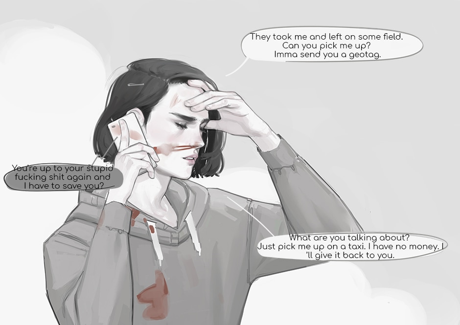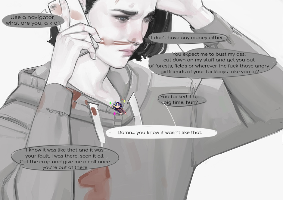 This is drama + angst. All the events take place in alternative reality where people survived a catastrophe and built a new technological world. It’s a comic about people living in this world, meeting and losing eachother, it’s a story saying that all things come to an end: good and bad. It’s a story about a robot-boy who tries to understand what being alive is like. It’s about the fear of loving, about the desire to be needed, motherly feelings and toxic friends. And much more.