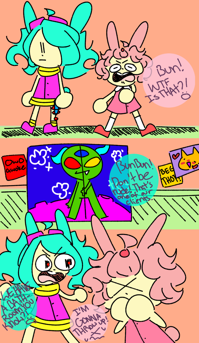 Bun brought BunBun to her work that day, for bring your kid to work day (even though they're actually sisters >.>) BunBun just wanted a day off from school, but now she's scared for her life jOKES ON HER LMAO.