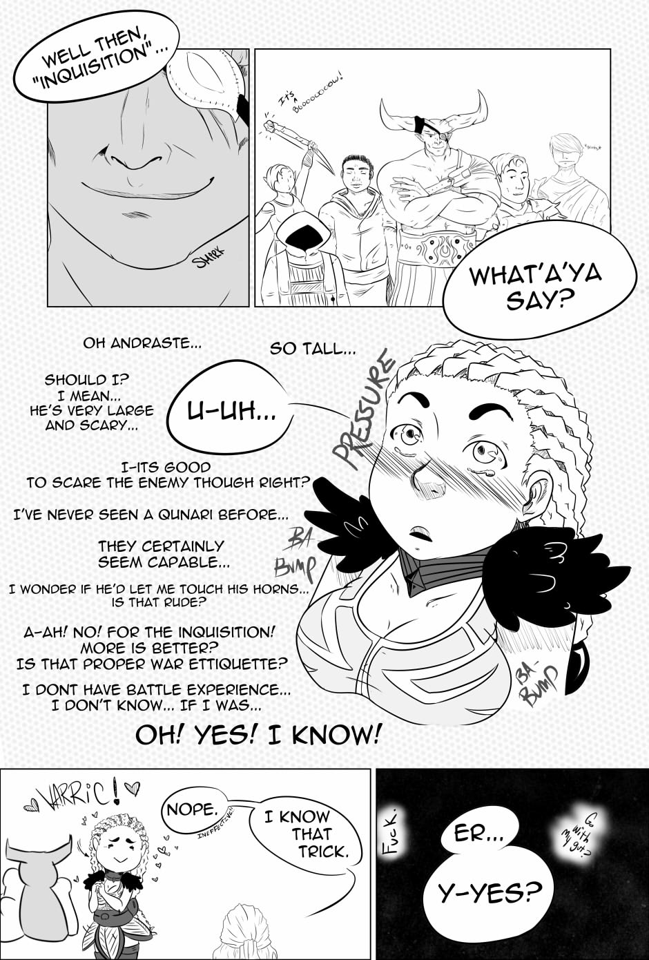 I don't know why, but instead of "it's a bow", I read "it's a boomstick!" Which is... not entirely wrong but still. Also, Did Mesa really come with no one but Varric for backup? That's brave for someone so nervous!