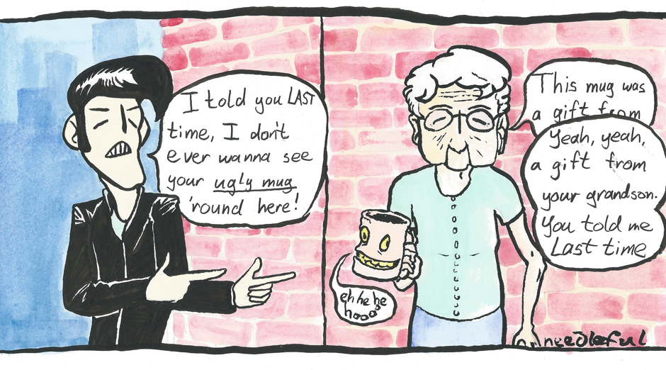 TRANSCRIPT: A tough-looking greaser points to someone in an alley. Greaser: I told you LAST time, I don't ever wanna see your UGLY MUG 'round here! He's pointing to an old lady. Lady: This mug was a gift from Greaser: Yeah, yeah, a gift from your grandson. You told me last time.