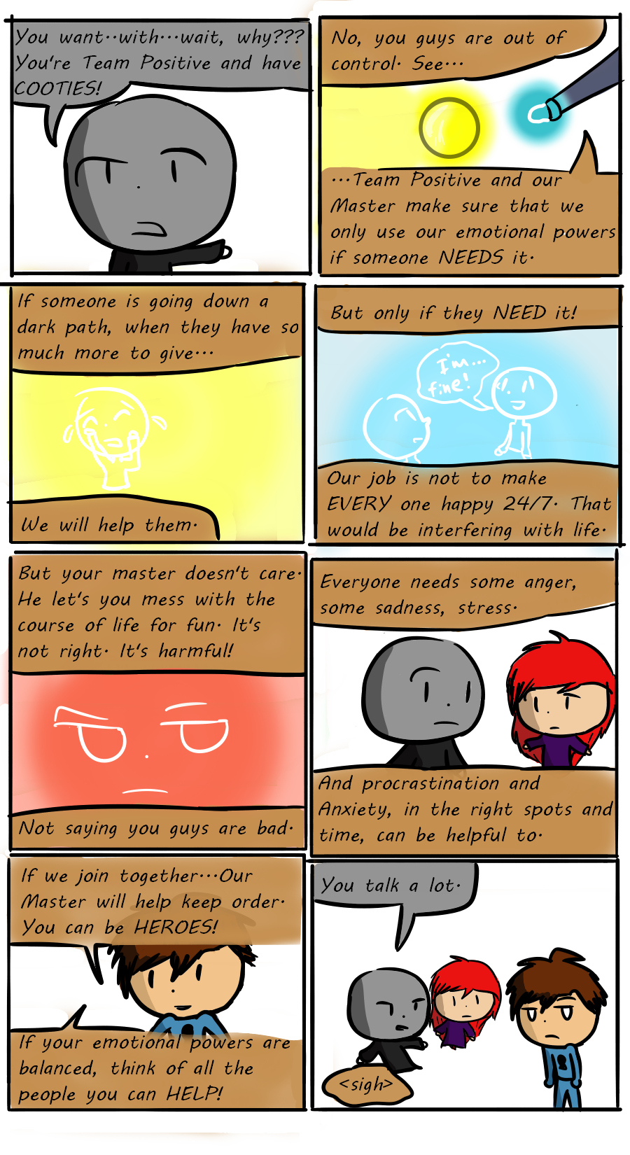 Trust and the rest of Team Positive want to work in harmony: Instead of them wrekclessly doing their thing (Page 1 and 2), they could work together to help others.