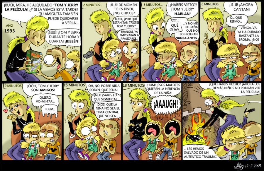 Unos detalles sobre la madre de Buck: cómo veis, es la típica madre feliz y encantadora, a la que le gusta cualquier cosa que sea para niños. Debo reconocer que me encantó ensayar sus expresiones y miraditas, y entre las caricas de ella y los rostros temibles de los niños, fue una tira muy divertida de dibujar para mí. XD