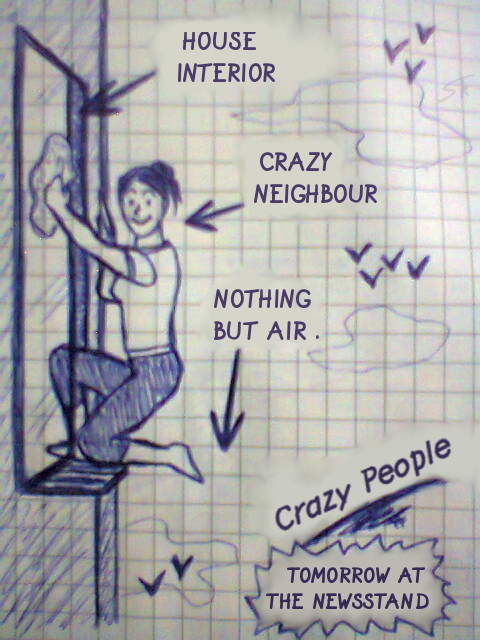 Here's an old sketch where I imagined the cover of a new magazine. The cover of course was fake, but the neighbour is real - she always washes windows like this in summer, from the third floor...
