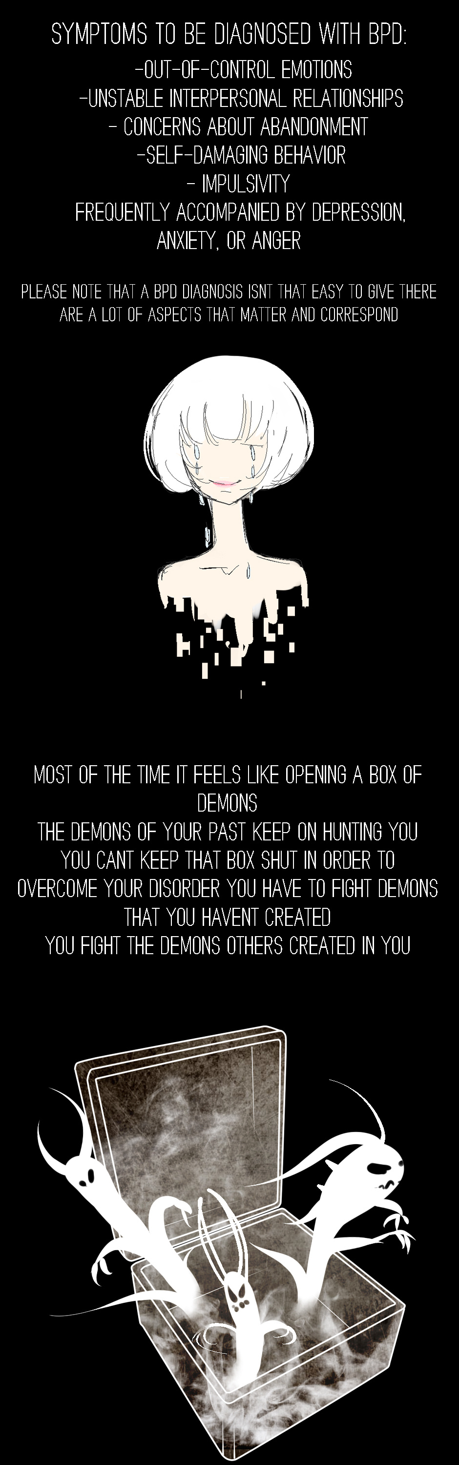After being diagnosed with Borderline Personality Disorder my whole life seemed to crumble and lost a lot of its "colour". I always knew that I had some kind of depression and several other mental illnesses. Doctors and even teachers told me I showed since of a BPD when I was very young and couldnt even understand what they ment. After years of running away and getting even more miserable I finally decided to talk about it and get professional help, a final diagnosis from a few specialists to ease my mind and finally fight this monster in my head. About a year of therapy and medication has now set me up with a more stable self and a plan to illustrate my disorder. In this comic I will show you some parts of myself and parts of my disease which are quite far apart. I wanna show the meaning of living this black and white life and the search for the grey in between.