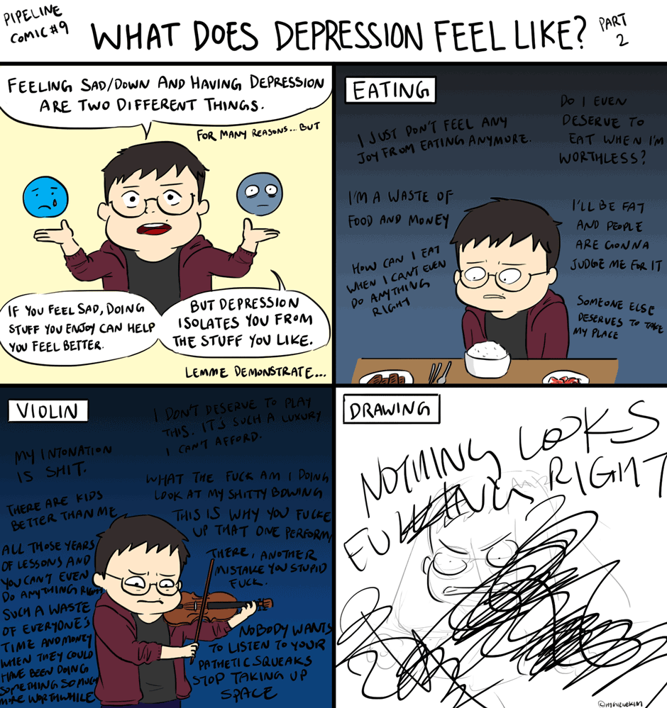 For me when depression hits hard, it's difficult to do the stuff I like because I'm constantly judging myself, and it doesn't help that I feel like this nasty, dense, viscous goo unable to move. I get frustrated trying to do the stuff I like, and I end up isolating myself.