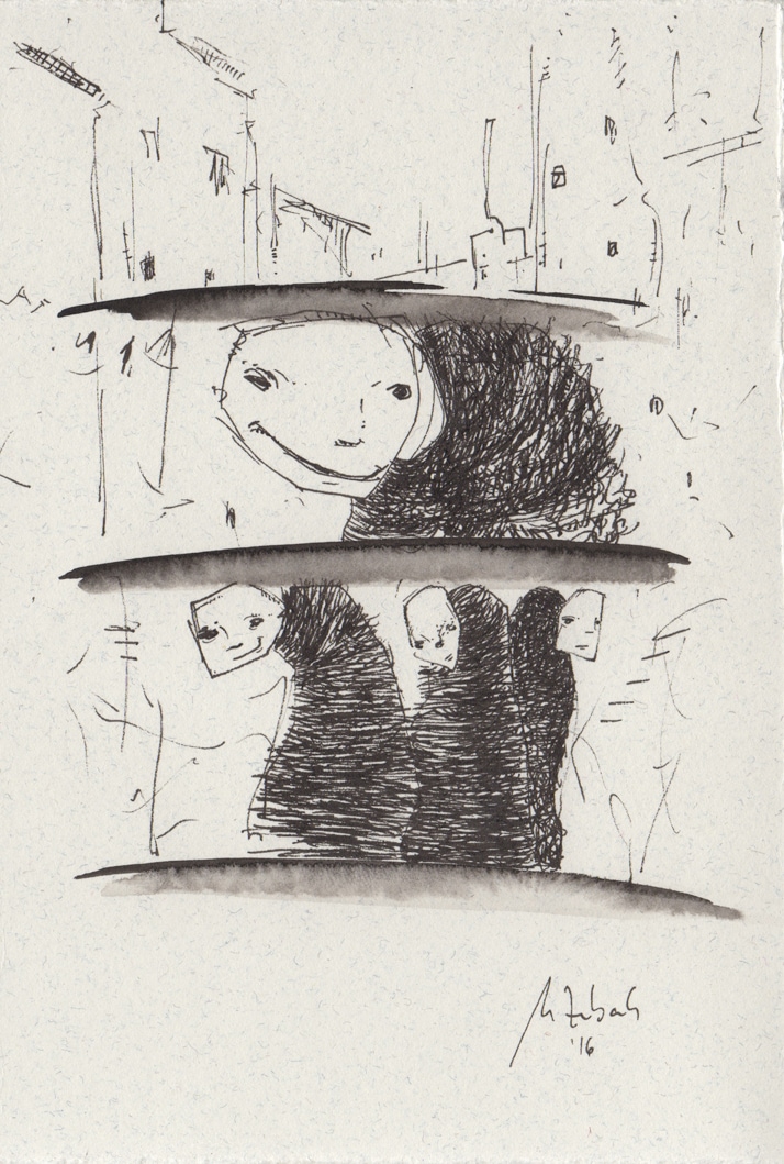 Framed MLIBTY drawing, ink on paper, 17x12 cm, 2016. (Frame is 25x20 cm, with glass).