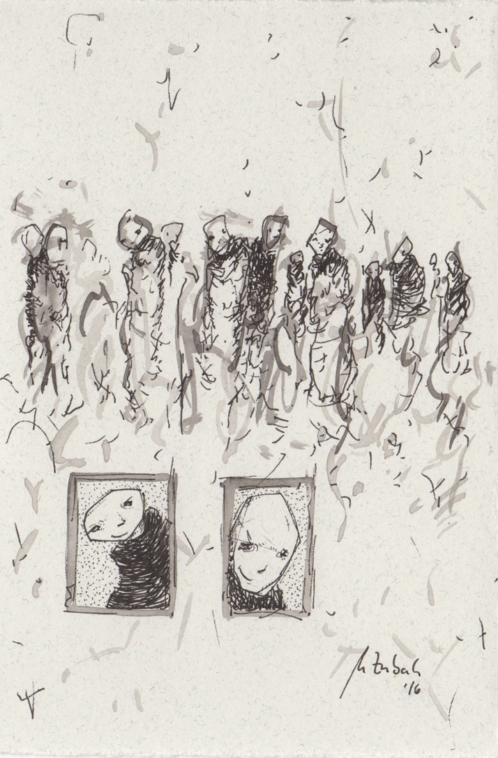 Framed MLIBTY drawing, ink on paper, 17x12 cm, 2016. (Frame is 25x20 cm, with glass).