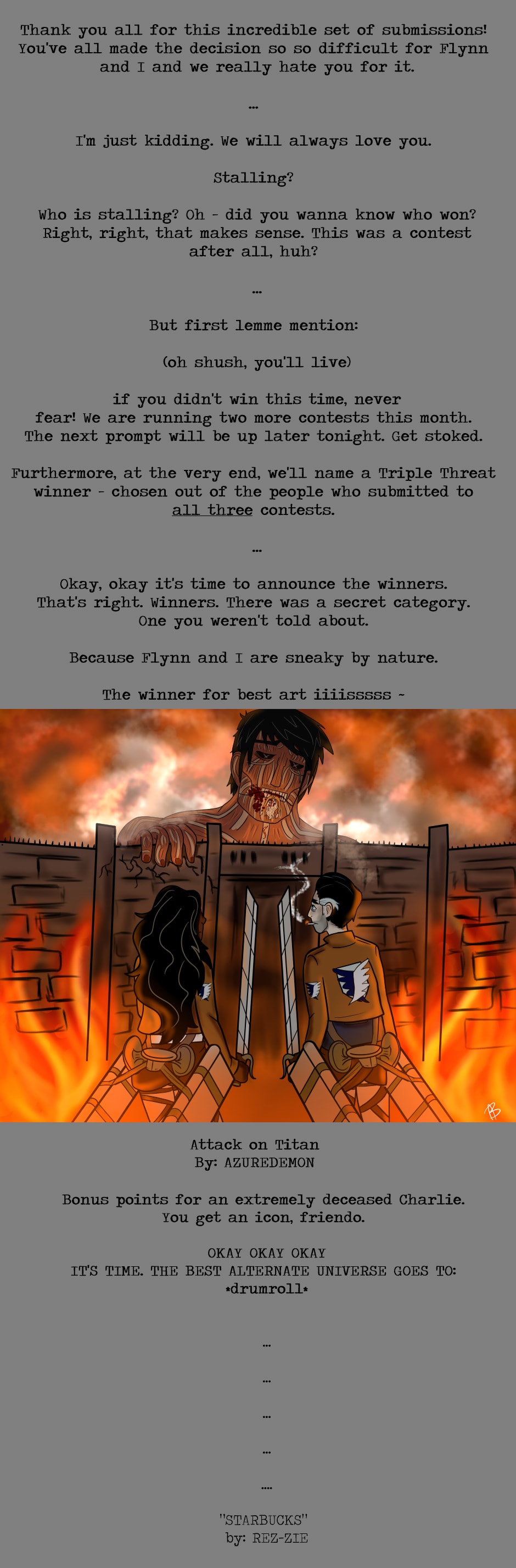Anyway. I’ll talk at ya more tonight. Enjoy your day, and congrats again to Azure and Rez-zie!~