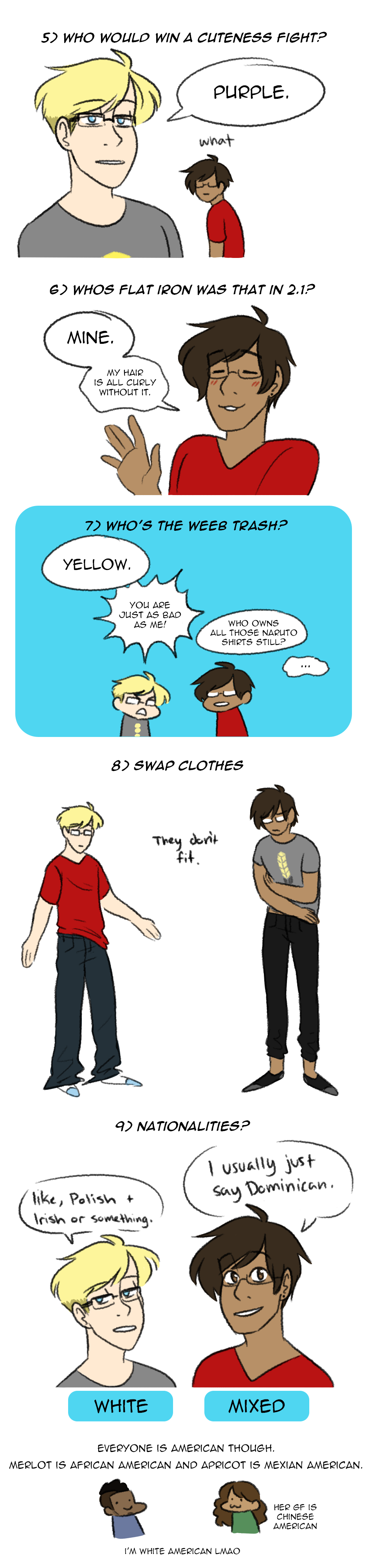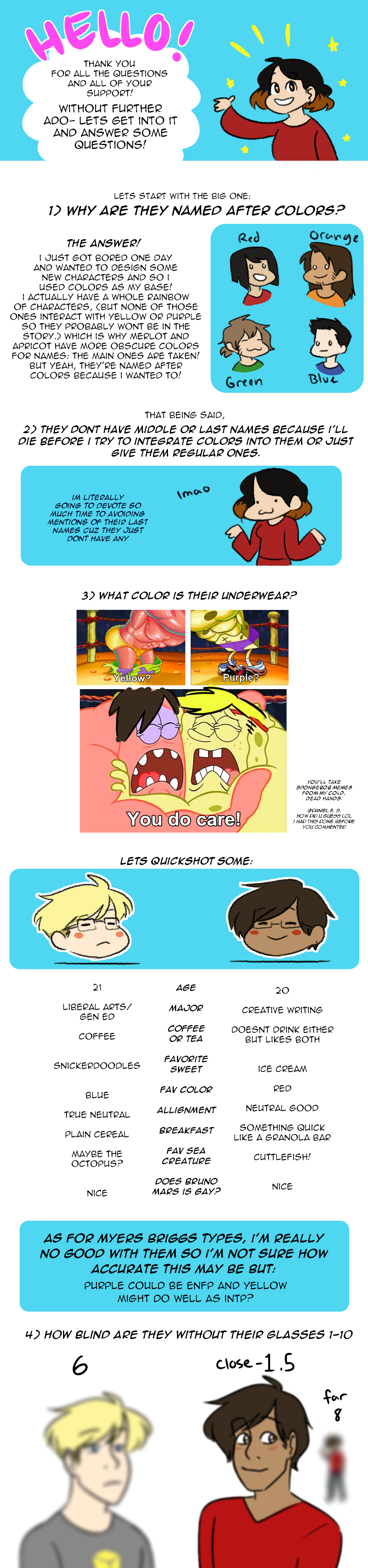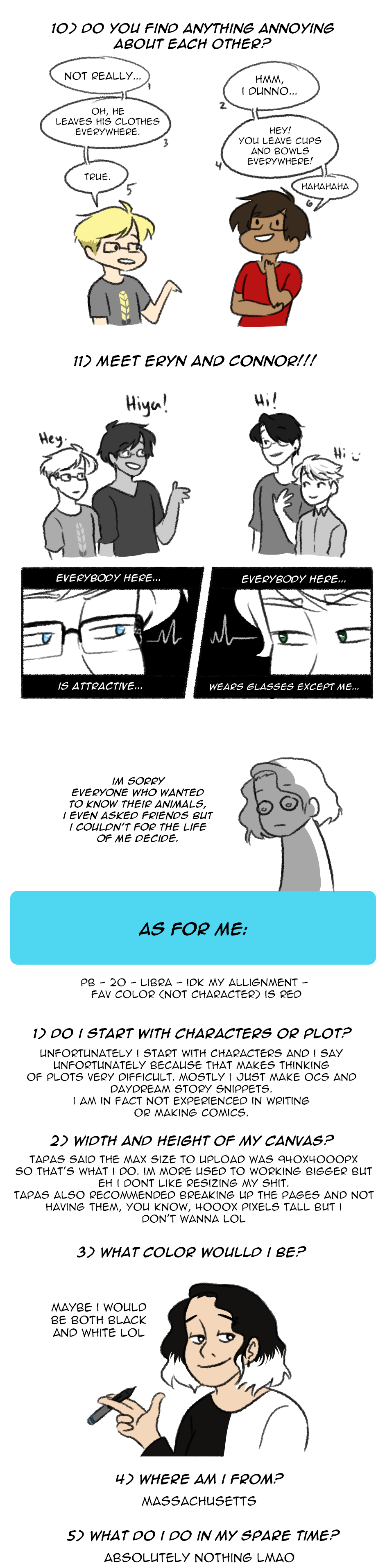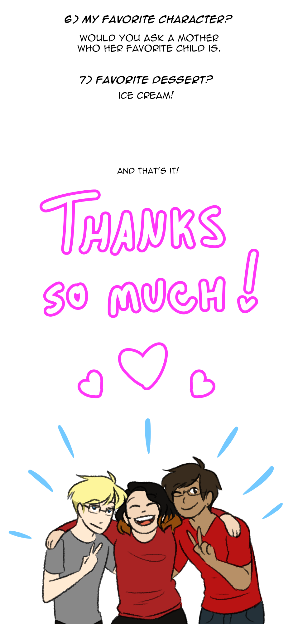 thanks to everyone who asked questions and thanks for all of your support!!! i honestly had more questions i actually really wanted to answer but i didn't want this to be as long as it already is so i cut it shorter. there are some questions though that will be answered as the comic progresses so those were left out too. ¯\_(ツ)_/¯