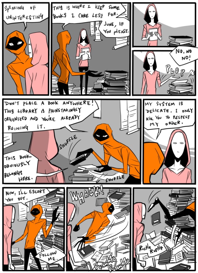 November: This library is painstakingly organized also November: *smash the wall of books down*