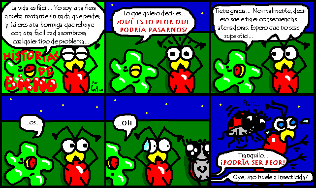 Pero Bicho no está solo, sino que comparte viñetas con extravagantes compañeros como Mebo, una ameba mutante, Buggi, una mariquita psicópata, o Gus, un gusano bastante simplón.