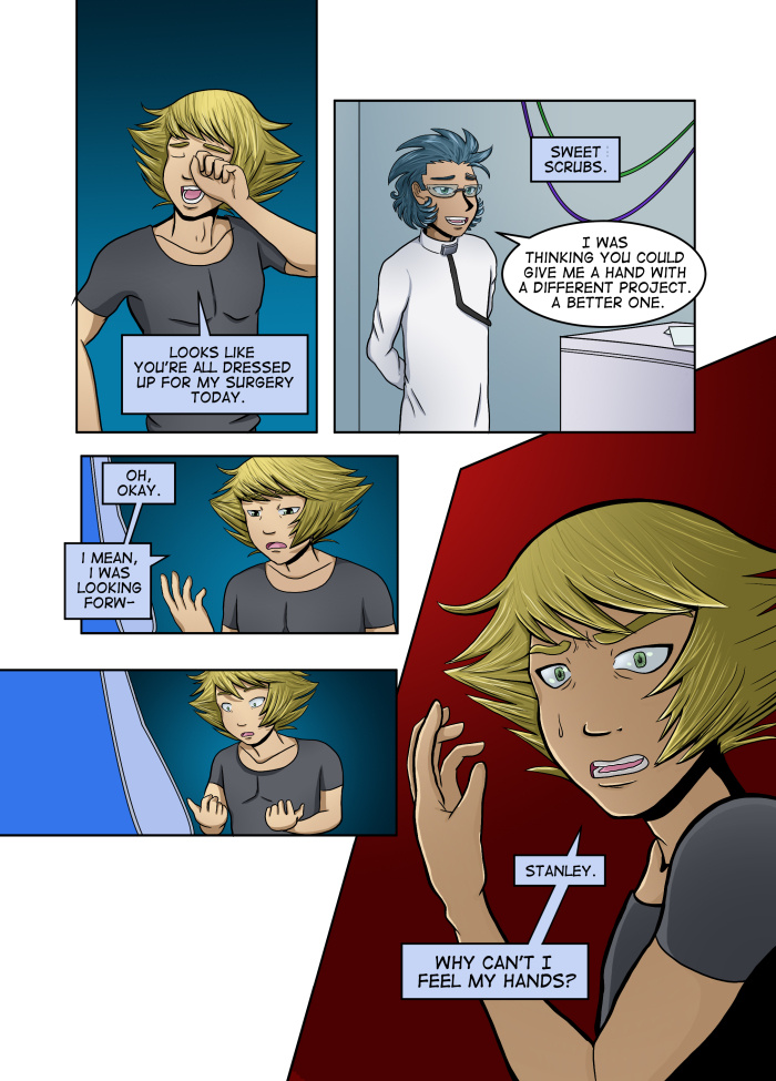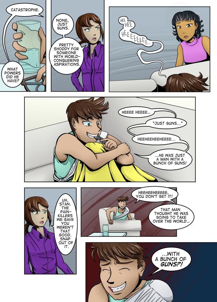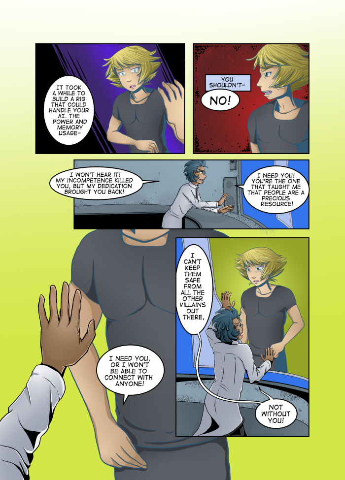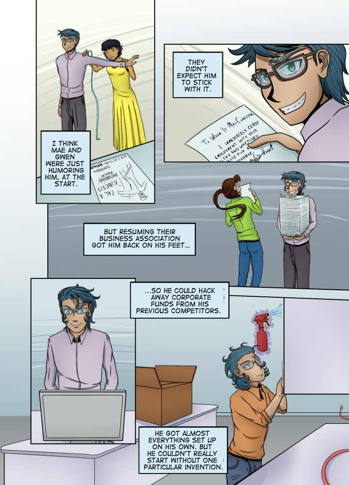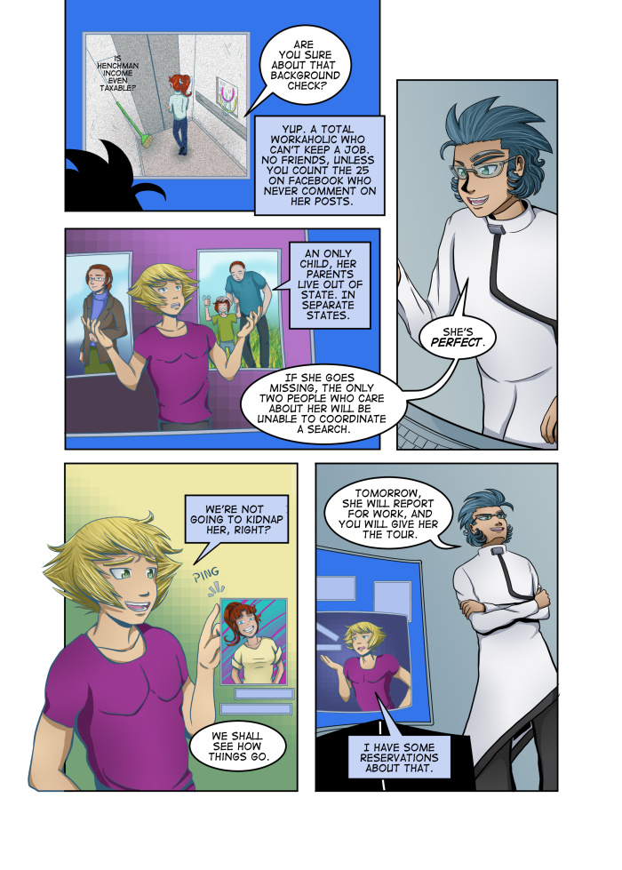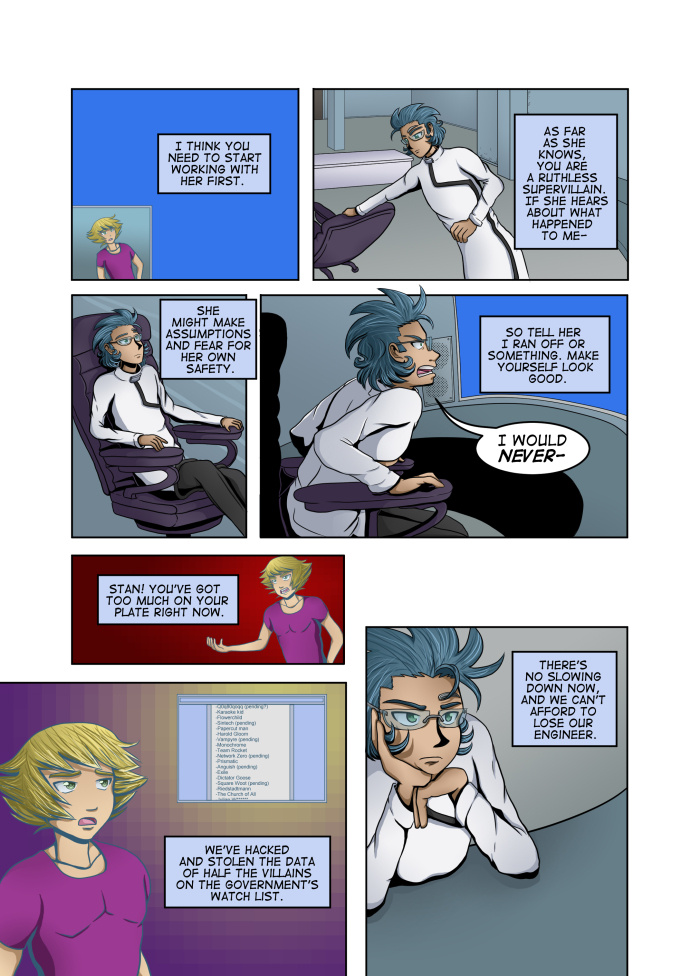 Evil Plan takes the superhero world and flips it, viewing things from the supervillain's perspective. The story follows Dr. Kinesis' journey on the road to world conquest. On the way, he'll have to deal with a troublesome AI, his unwilling friendship with crazy black-market dealers, and the possibility of romance with his second-in-command. And the superhero. Can't forget that guy.