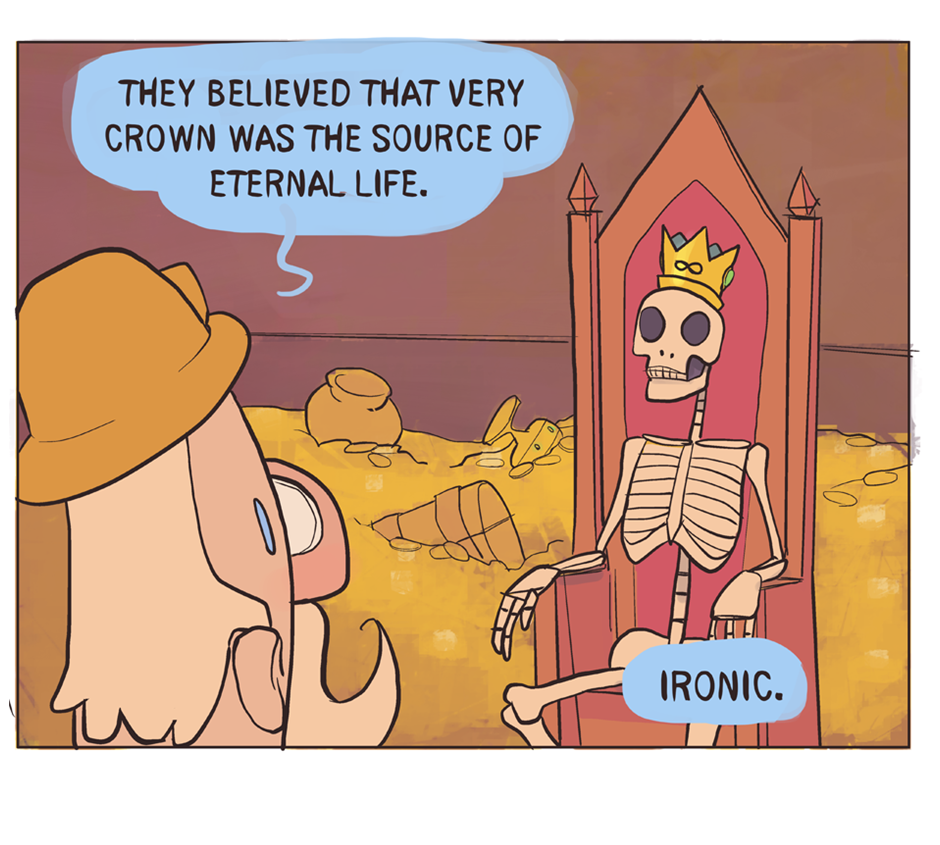 Dave, ever in dire financial straits, gathered up as much gold as he could carry. When he returned home he was shocked to discover that it was chocolate coins all along, and, perhaps worst of all, most of it had melted in his pockets.