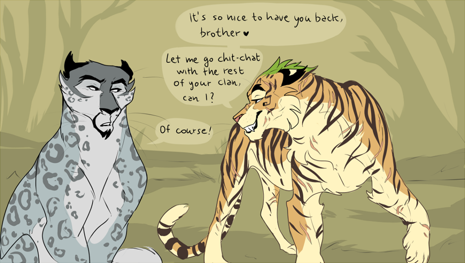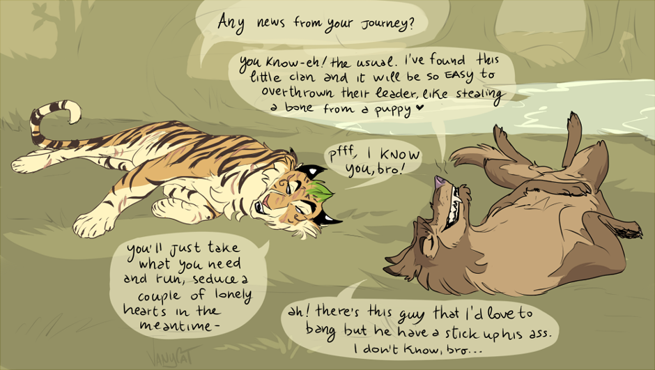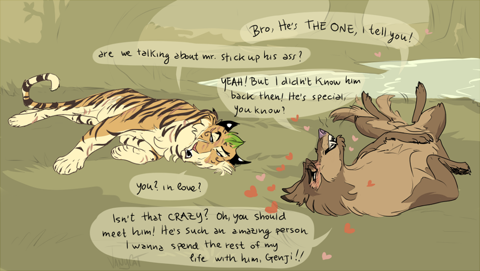 Even after meeting Morrison’s Clan, Jesse sometimes wanders off to the waterhole flock. He’ve been there a lot of times in need of help and healing and Genji became his best bro. They share every secret and Genji know about Jesse’s habit to betray other’s clan, but he’s neutral and doesn’t judge.