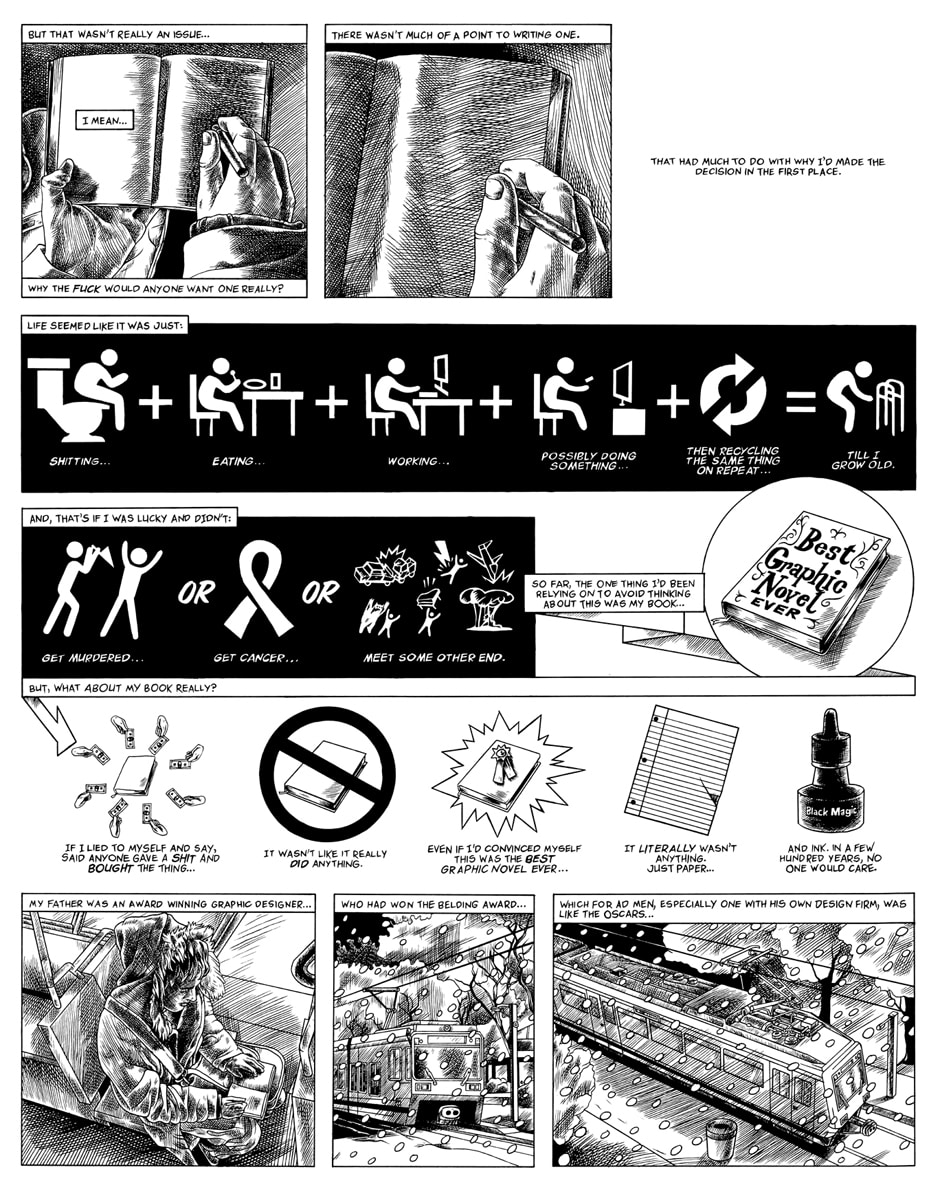 Alright we’re at page six! I thought it would be funny to go through the process of logic that I used to go through when I was at this point of depression in my life as though it was a mathematical equation or infographic. The Belding awards used to be a prestigious advertising award. I remember my father used to have the award (this big silver bowl) sitting on a side table and filled with potpourri. It seemed like it was just a silver bowl of some sort for years, till I finally thought to ask him one day what it was, and he explained the award, which was apparently a big deal in the advertising world. I’ve since found out that they no longer even exist as an award. I feel like I’m finally settling into the style on this page. I hope you guys are enjoying the story so far.
