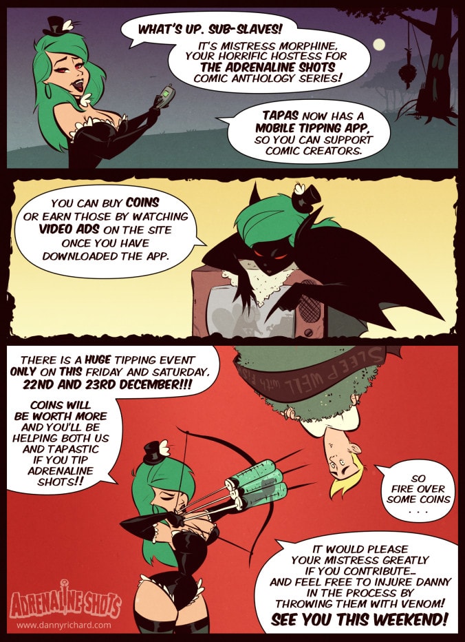 Hey Guys another tipping event is here today and tomorrow, if you want to support the comic FOR FREE please read and tip! Thanks guys, every little bit really helps and is hugely appreciated! If you like the comic and want to see more made please support.