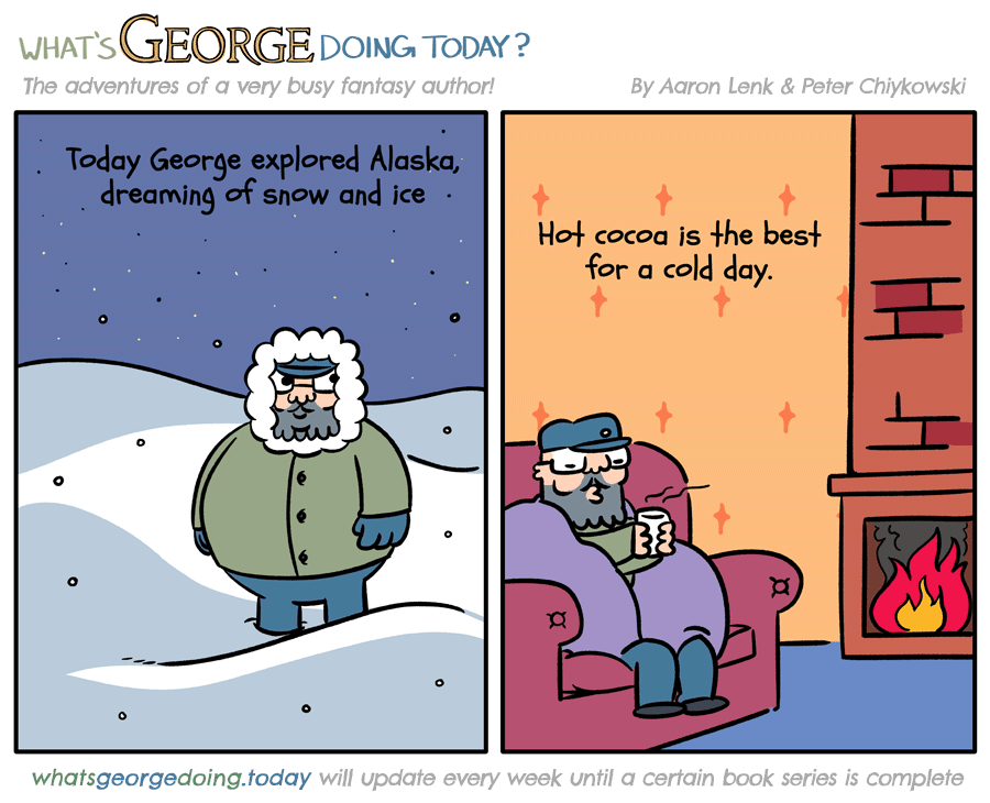 Bundle up, George! George is a very busy fantasy author with a very important book to write--just as soon as he finishes his next adventure! We're chronicling George's journeys every week until a certain book series is finally complete. Follow along! Website: http://whatsgeorgedoing.today Facebook: http://facebook.com/whatsgeorgedoingtoday/ Instagram: http://instagram.com/whatsgeorgedoing/ Tumblr: https://whatsgeorgedoing.tumblr.com/