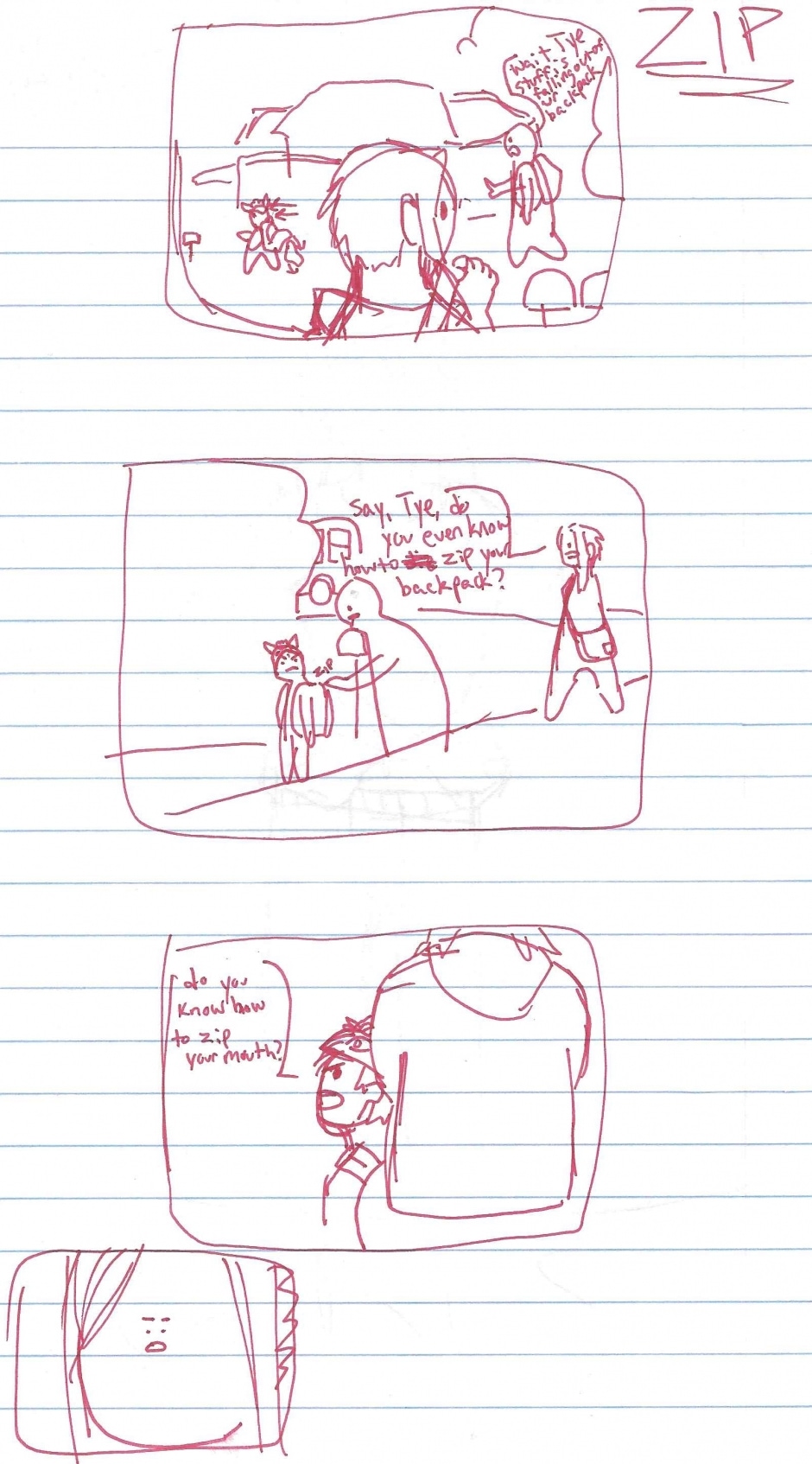 Z: Wait, Tye stuff is falling out of your backpack M: Say, Tye, do you even know how to zip your backpack? T: do you know how to zip your mouth? My little cousin is a nuisance.