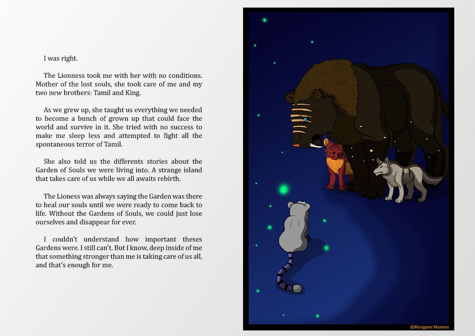 Nyeleti is a young panther living in a Garden of Souls, a place where creatures live freely before they come to life in a real world.