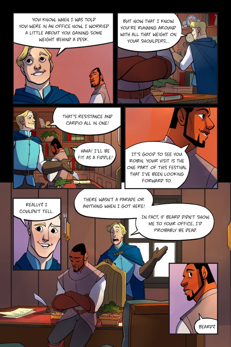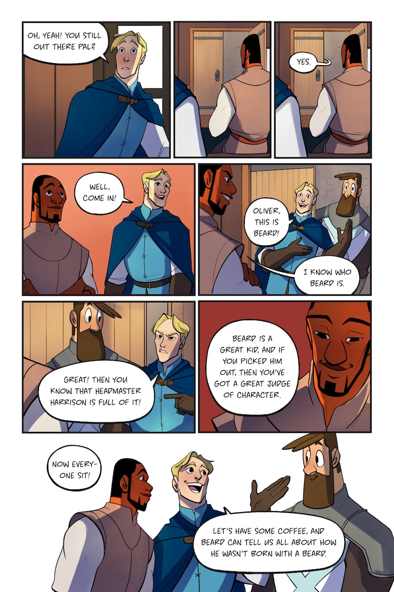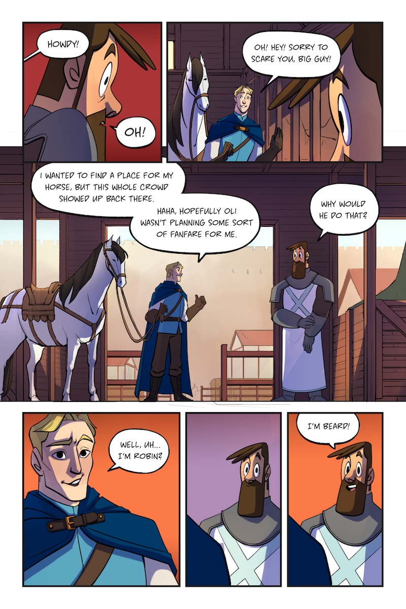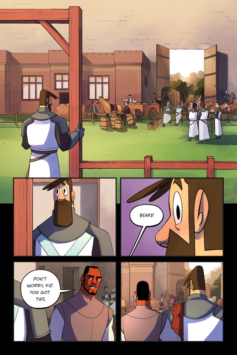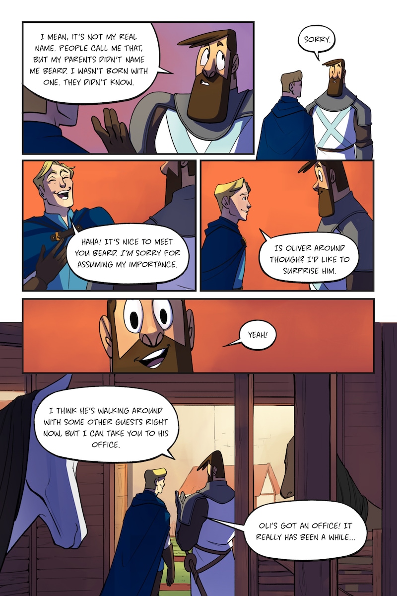 Knight and Beard is a buddy comedy set in the medieval times. Knight is an unruly noblewoman who dreams of becoming a hero, but her privileged upbringing hinders her battle. Beard, on the other hand, is a man with the build of a warrior, but a gentle and loving soul.