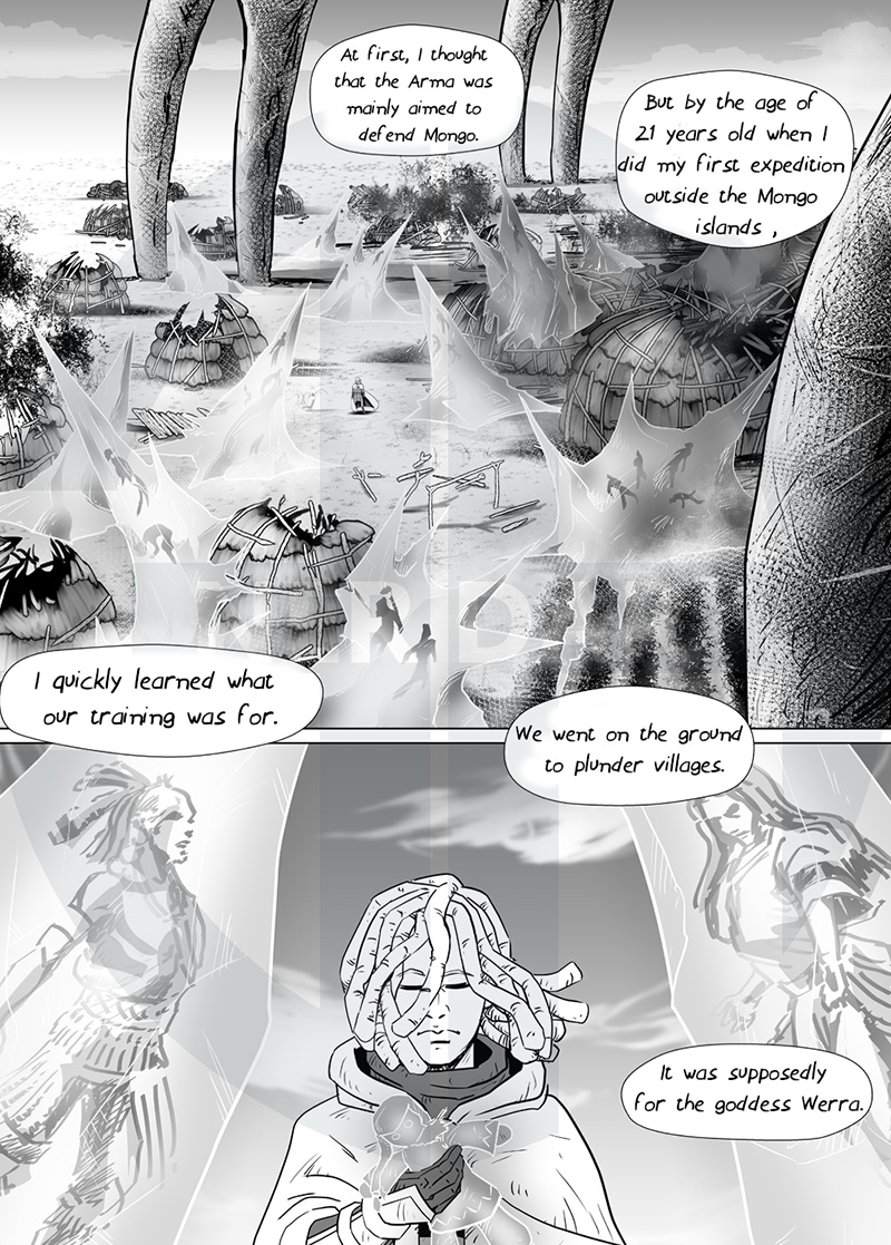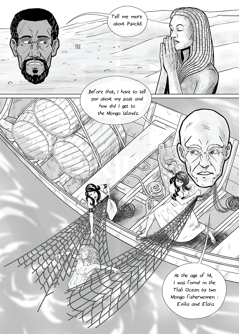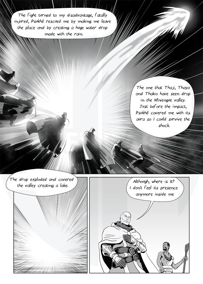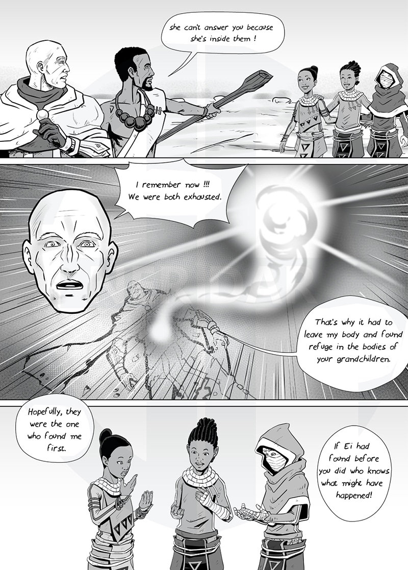The grandchildren of Thioro the hermit of Dzielo see a drop of water crashing in the desert. They decide to go there.