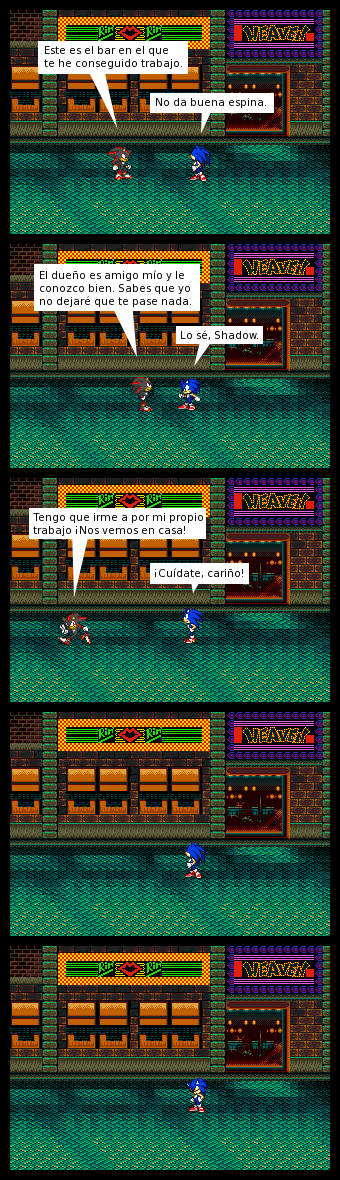 En 2012-02-21 dije: A pesar de las nuevas oportunidades y del optimismo, Sonic debe enfrentarse a las dificultades de los ex-presidiarios para reinsertarse. De nuevo he tenido que usar gráficos de otro videojuego debido a las necesidades del guión, en este caso de Streets of Rage.