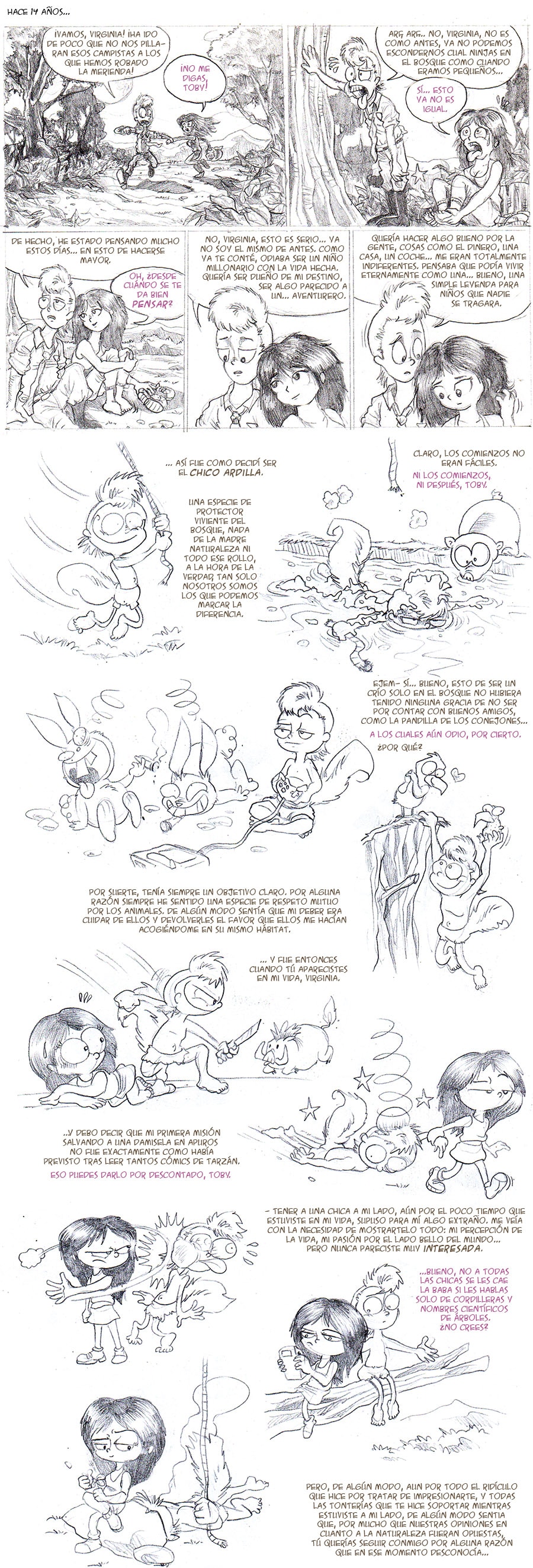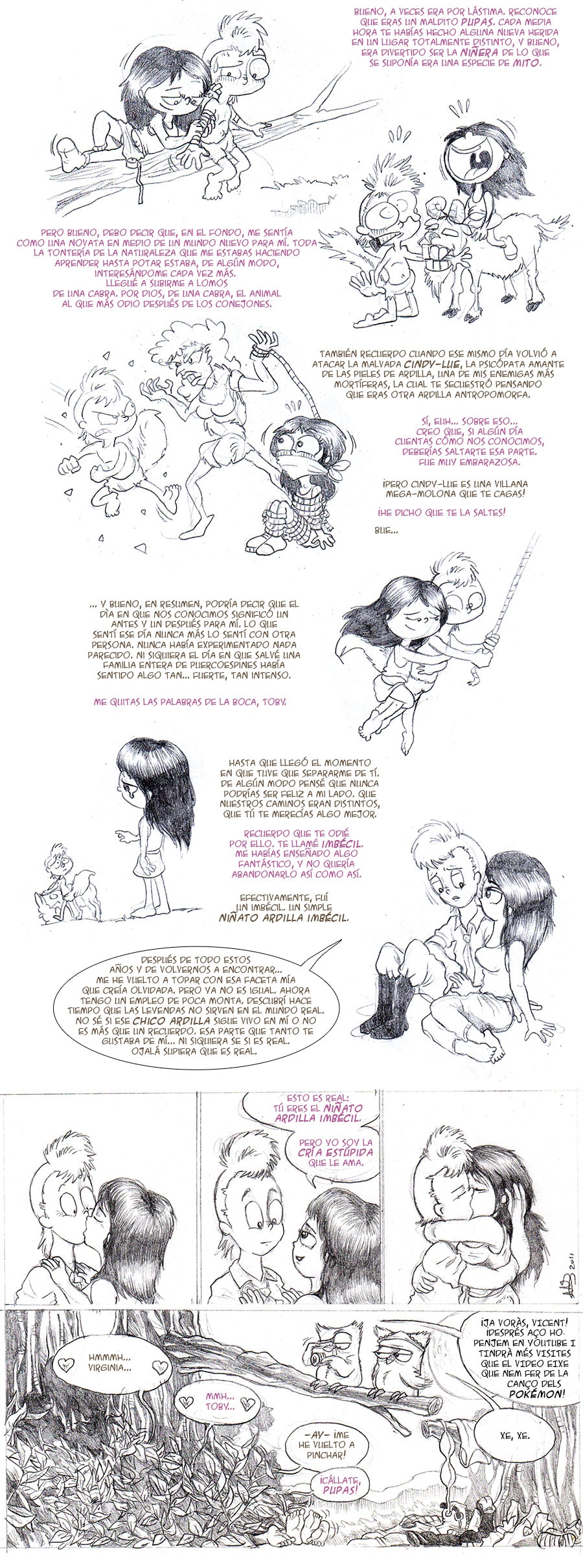 Lo que sigue ahora, mejor dependería de vuestra opinión. Con vuestros comentarios, me han surgido muchas ideas, y, sí, notareis que hay muchos personajes que se han quedado en el candelero para poder protagonizar historias propias... Es por ello que podría dibujar nuevas tiras, de caracter autoconclusivo, con los conejos heavys, la pandilla de Fede (y su abuelo robacoches), los buhos valencianos... más que nada, para poder continuar este webcomic y que no quede como algo eventual, que no se quede estancado para siempre. Quien sabe, puede que algún día pueda realizar una segunda parte, ya sea continuando a partir de aquí, o, al estilo Tarzán 2 de Disney, en el intervalo que pasa entre el primer encuentro con Virginia y el nombramiento de Toby como guardabosques, para así no perder la esencia del personaje. Opinad qué os parecería, por favor.