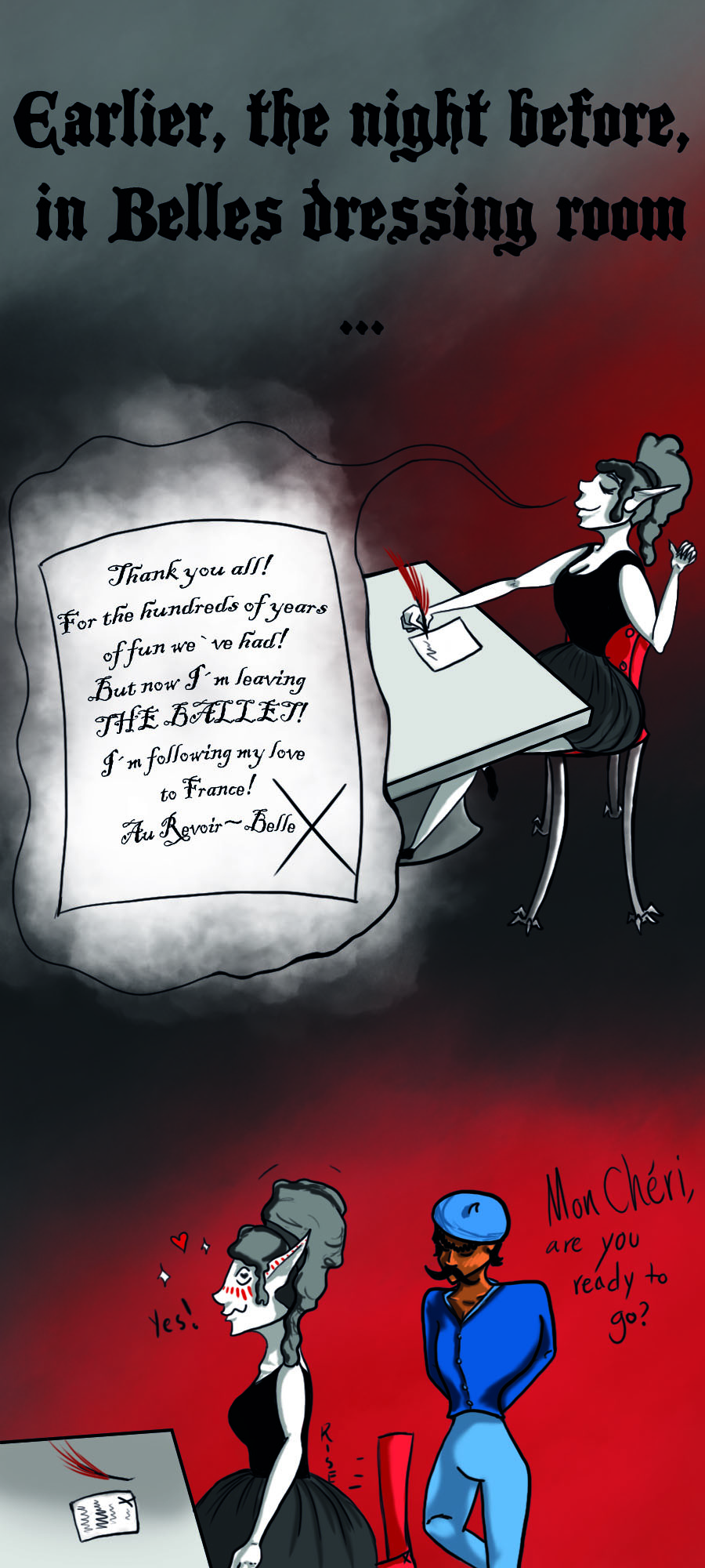 A young ballet dancing girl finds the peculiar note after being fired from her most recent job. In a desperate move she applies and stuns all the vampires who immediately hires her. She packs her belongings and off they go…