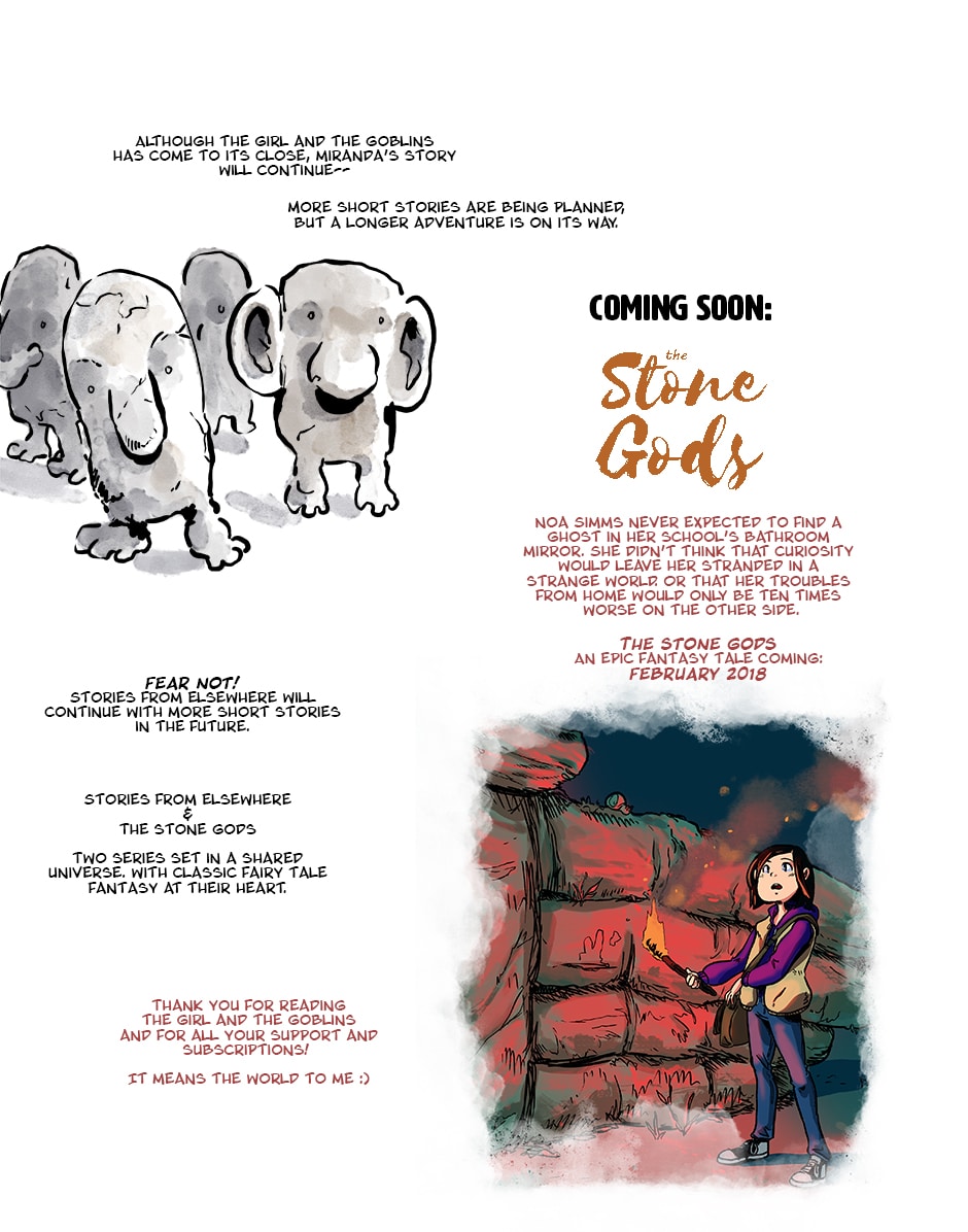 Thank you for reading the "Girl and the Goblins"! Stories from Elsewhere will be on a short hiatus while "The Stone Gods", a long fantasy epic, is launched in early February. Thank you for your support!