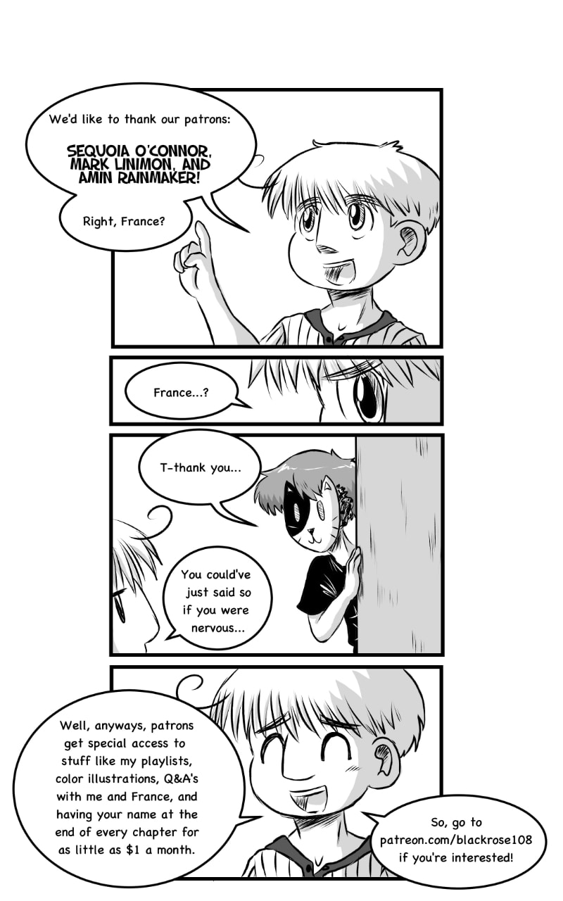 A coming-of-age story about two boys. France, who mysteriously wears a cat mask, and Ken who befriends him despite that. But, the closer they get, the more their secrets begin to slowly unravel. *IRREGULAR UPDATES* *PHYSICAL BOOK NOW AVAILABLE ON AMAZON!* *CHECK @BRose_108 FOR INFO/DELAYS/ETC.*