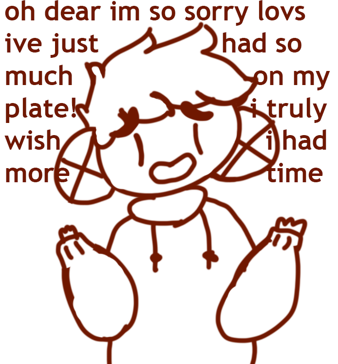 hey sorry ive been gone. ive got a busy schedule and procrastinate a lot and need to be constantly harassed.