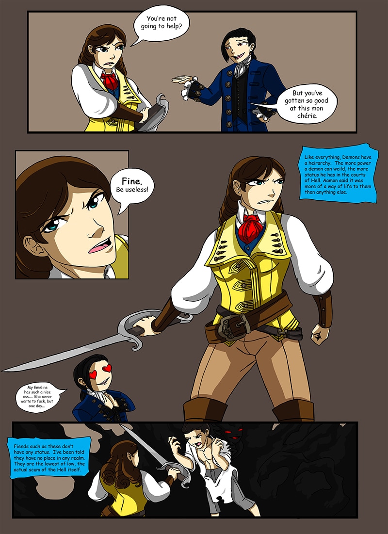 Emeline has struck a bargain with the Demon Aamon in order to save her life from the guillotine during the Reign of Terror. Now begrudge she is tethered to her supposed savior as the two work in shadow to uncover some nasty truths of the French Revolution, and the people pulling the strings. In the end Emeline must ask herself, are these people more monster then man, and how many will she have to cut down before this ends and her soul is eternally claimed by the demon she strives to fight away from.